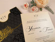 Celebrate your wedding with grace and tradition using our Black & Gold Islamic Wedding Invitation. Featuring a striking black textured sleeve with gold foil Arabic Basmala, paired with a soft pearl ivory insert card, this design blends faith and elegance beautifully.