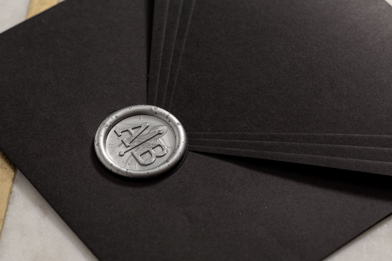 The combination of matte black elegance and handmade silver wax seal creates a premium, unforgettable invitation—perfect for setting the tone of a sophisticated wedding.