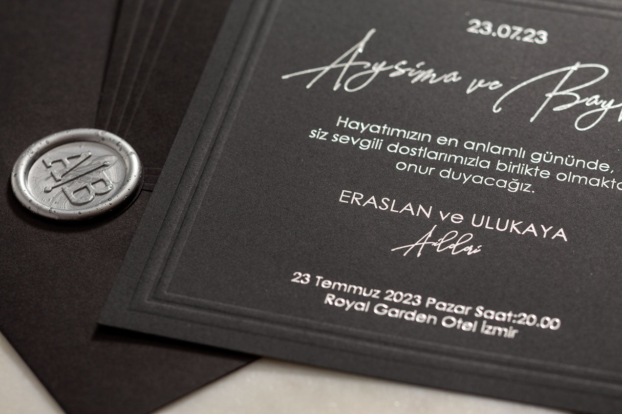 Black Luxury Wedding Invitation with Silver Wax Seal – Modern Elegant Design