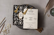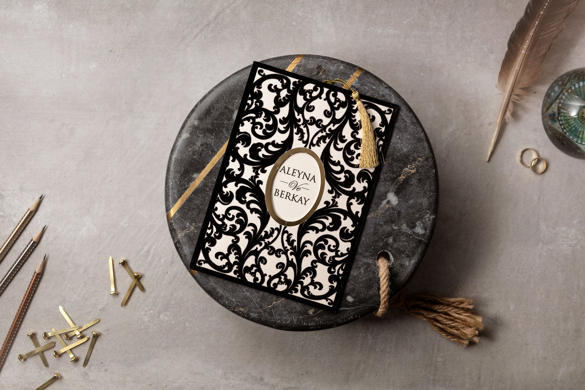 Black Velvet Patterned Wedding Invitation with Gold Oval Frame & Tassel