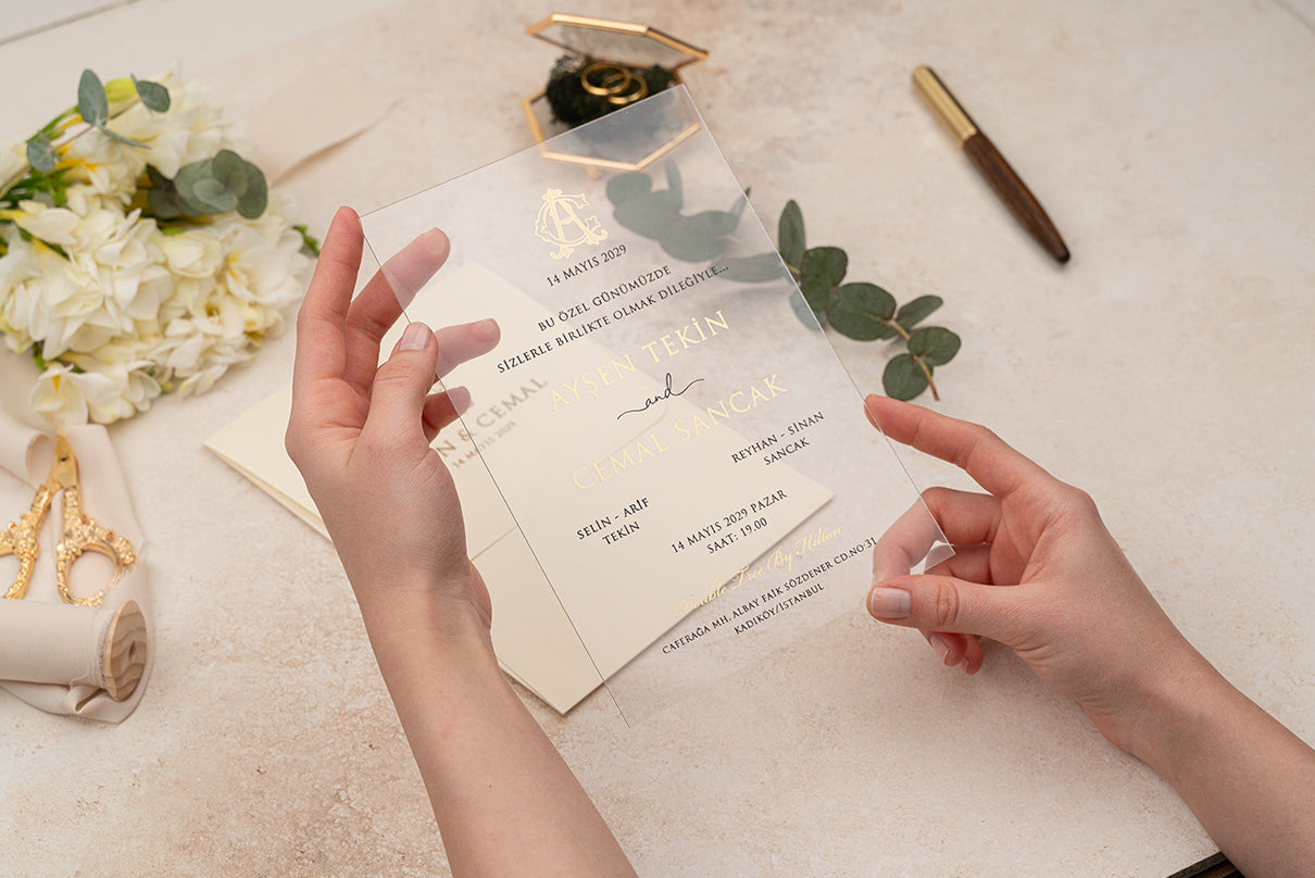 A crystal-clear acrylic (plexi-style) invitation with elegant gold foil typography and a refined monogram—perfect for chic, contemporary weddings.