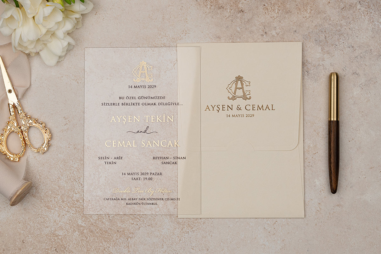 Clear Acrylic Wedding Invitation with Gold Foil & Cream Envelope