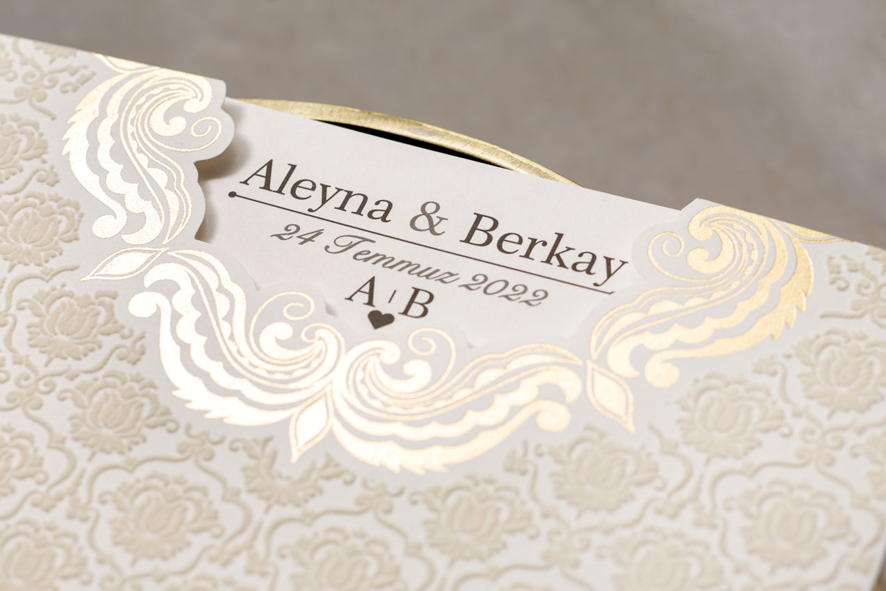Designed for timeless love stories, this invitation balances subtle texture and gold brilliance. Ideal for couples who appreciate classic charm with a refined flourish.