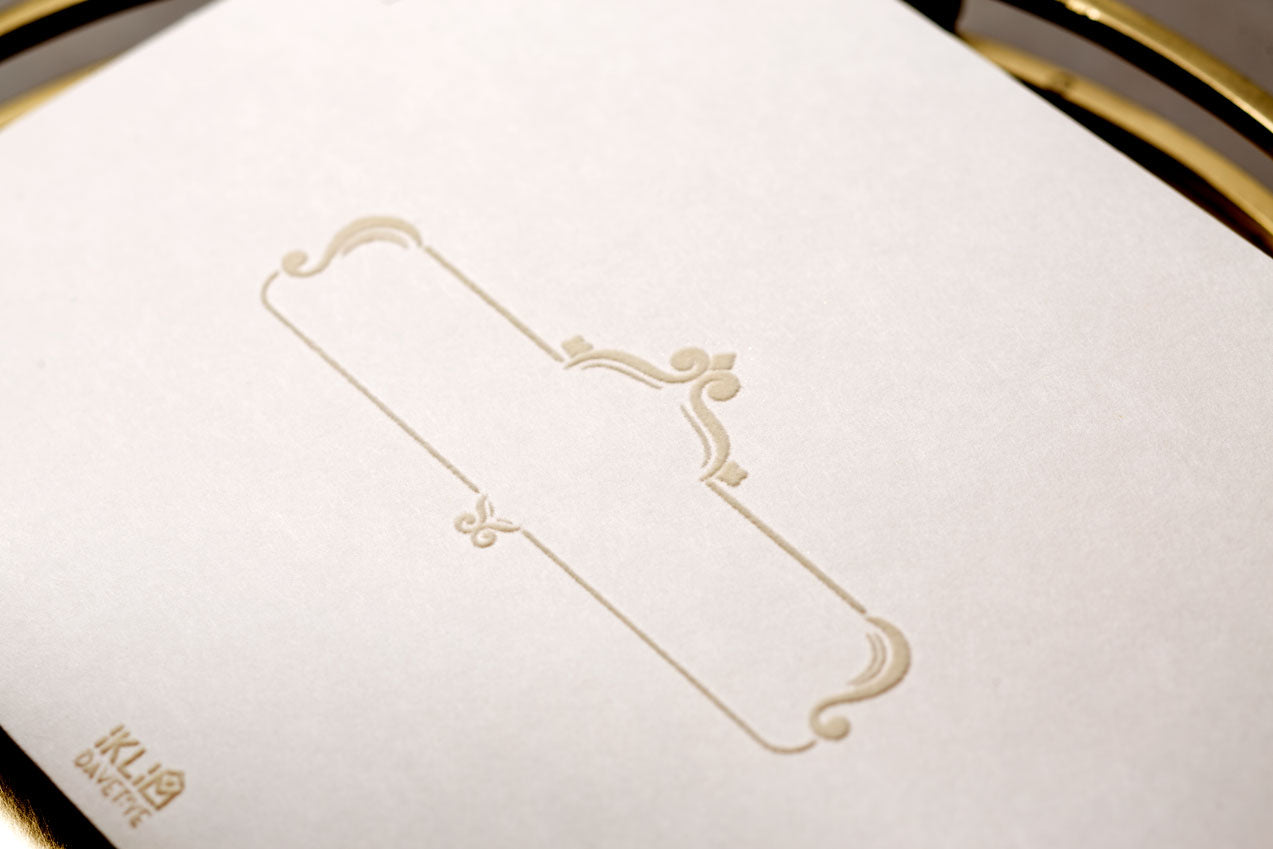 Cream Embossed Wedding Invitation with Gold Scroll Accent