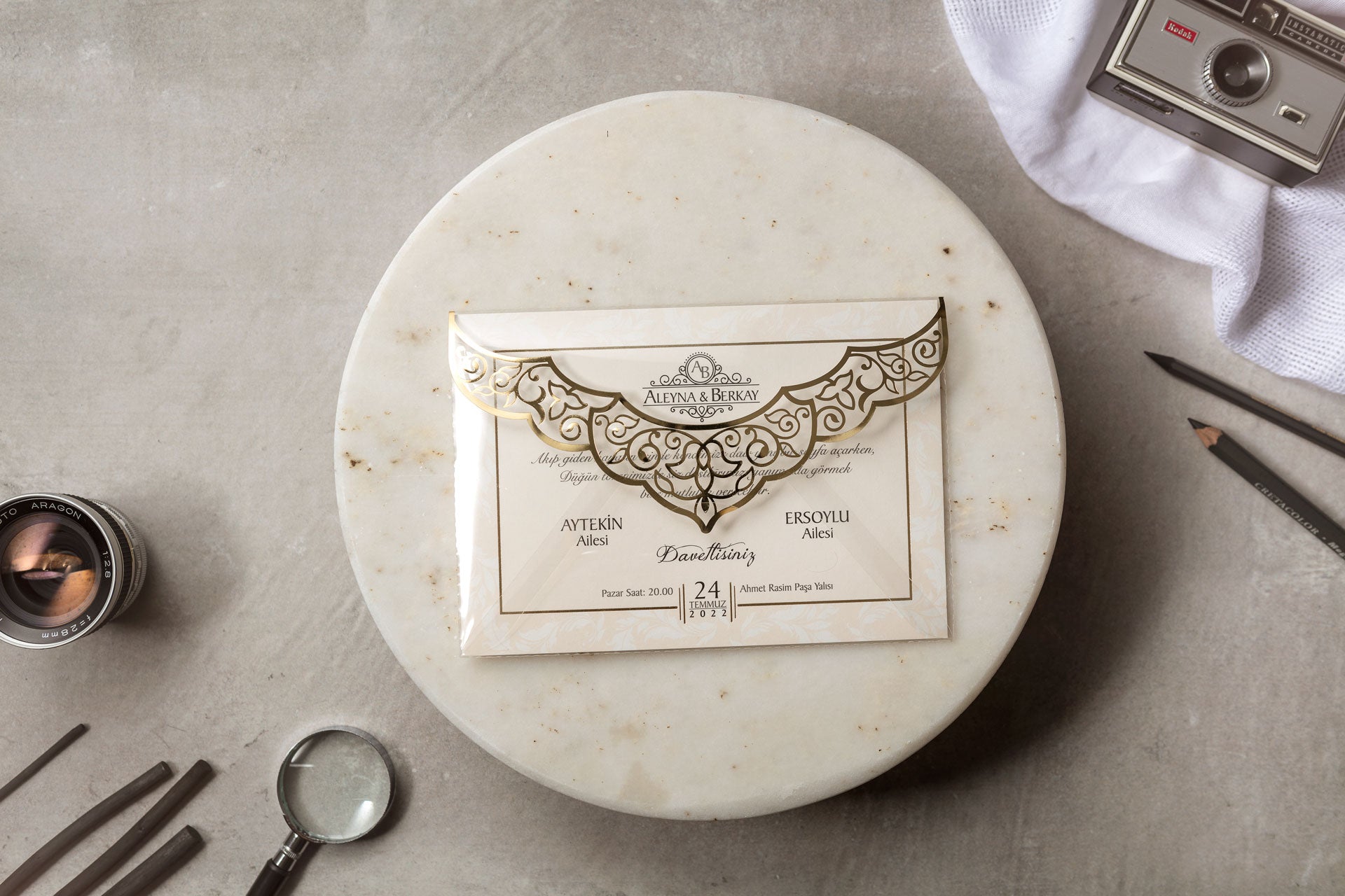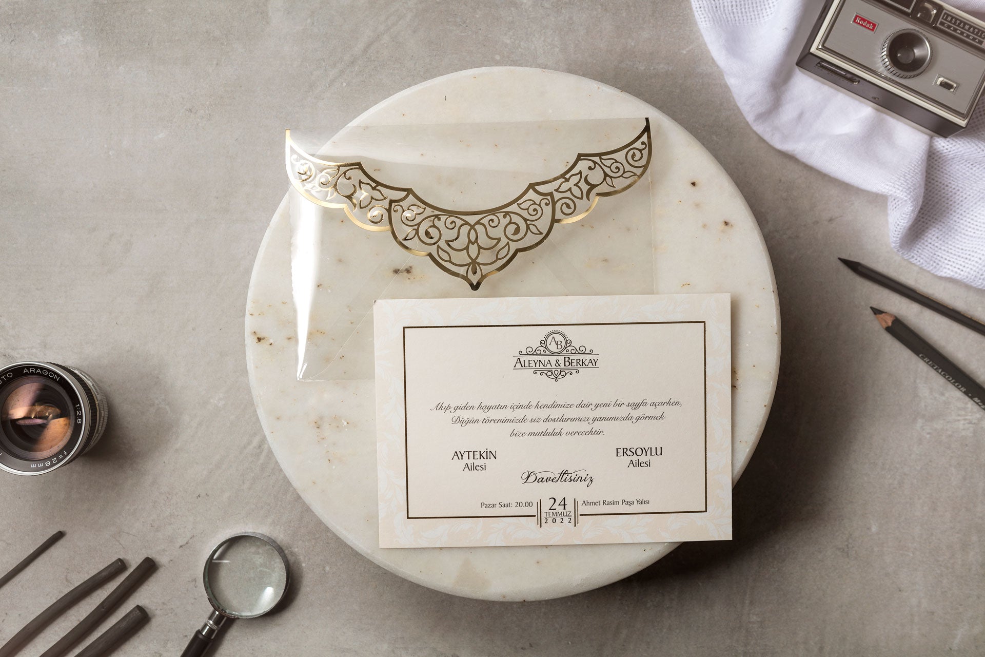 β¨ Front Detail: Scalloped flap with intricate gold foil embellishments
