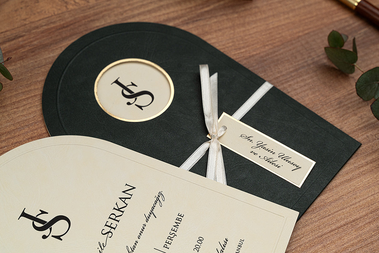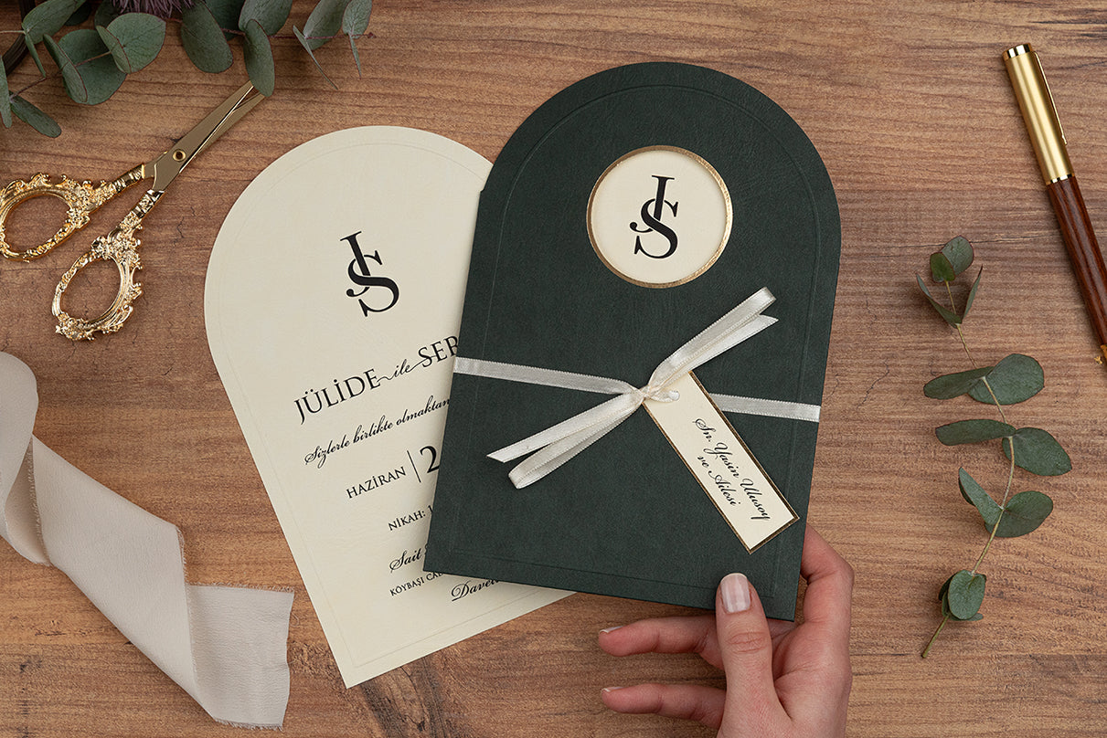 π¦ Complete Matching Set β Includes the arch-shaped green envelope with ribbon, monogram emblem, and matching cream insert card.