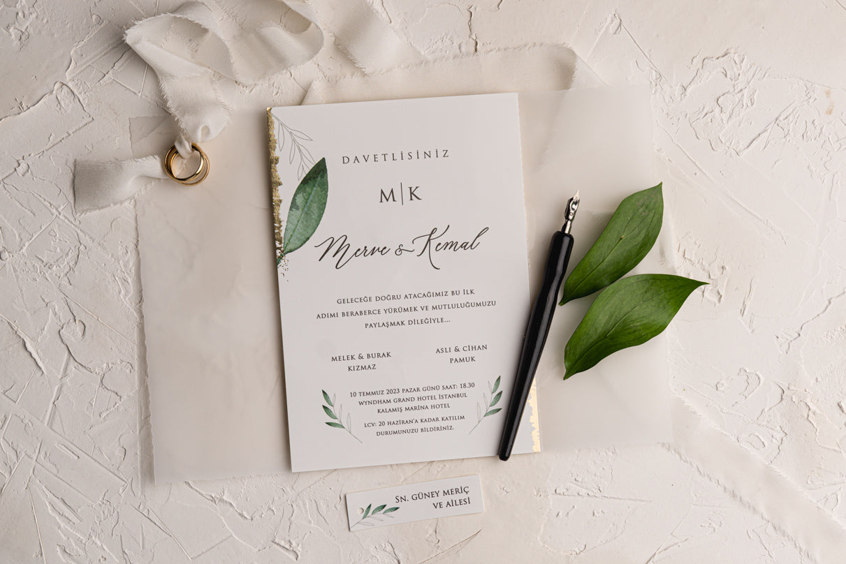 Celebrate your special day with our refined botanical wedding invitation, featuring soft greenery elements, delicate typography, and gold foil detailing along the edge. Wrapped in translucent vellum and tied with a matching string, it offers a harmonious blend of elegance and nature. Ideal for couples seeking a timeless and organic aesthetic.