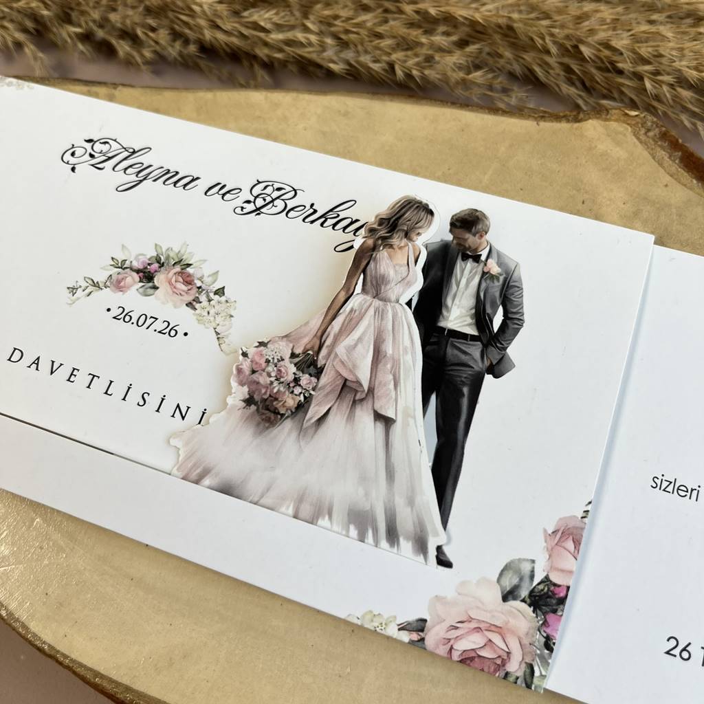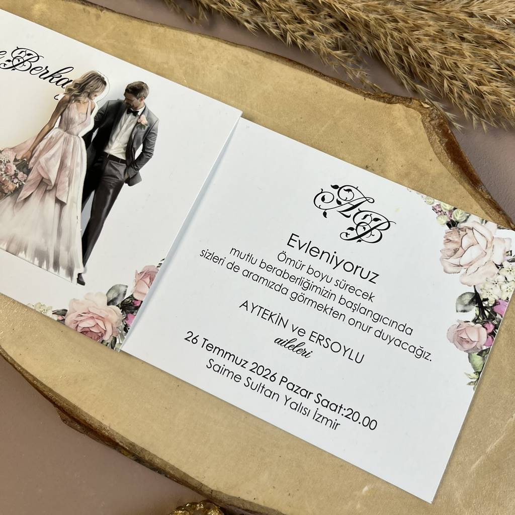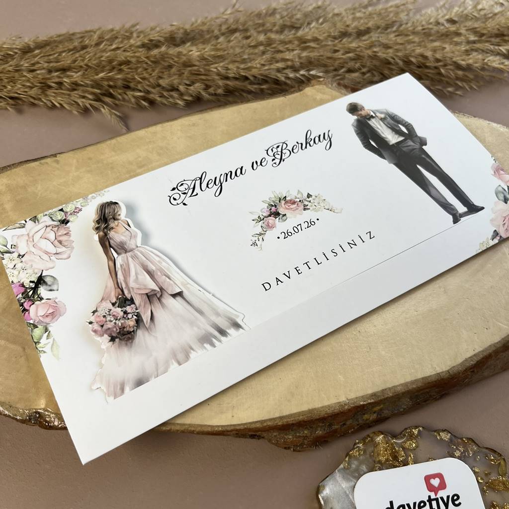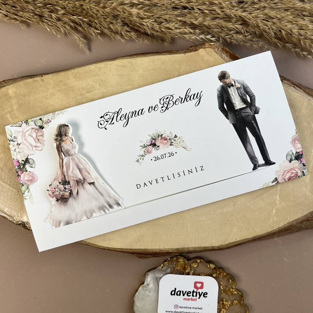 Celebrate your special day with this sophisticated and romantic wedding invitation featuring a beautifully illustrated bride and groom. The design highlights soft blush pink florals and fine calligraphy, set on high-quality textured paper. The animated sliding mechanism reveals your personalized ceremony details, making this invite both elegant and interactive.