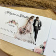 The front showcases the couple's names, wedding date, and delicate floral art, while the inside continues the romantic theme with a full-size illustrated couple and wedding text. It’s the perfect choice for couples who value graceful design and timeless charm.