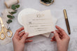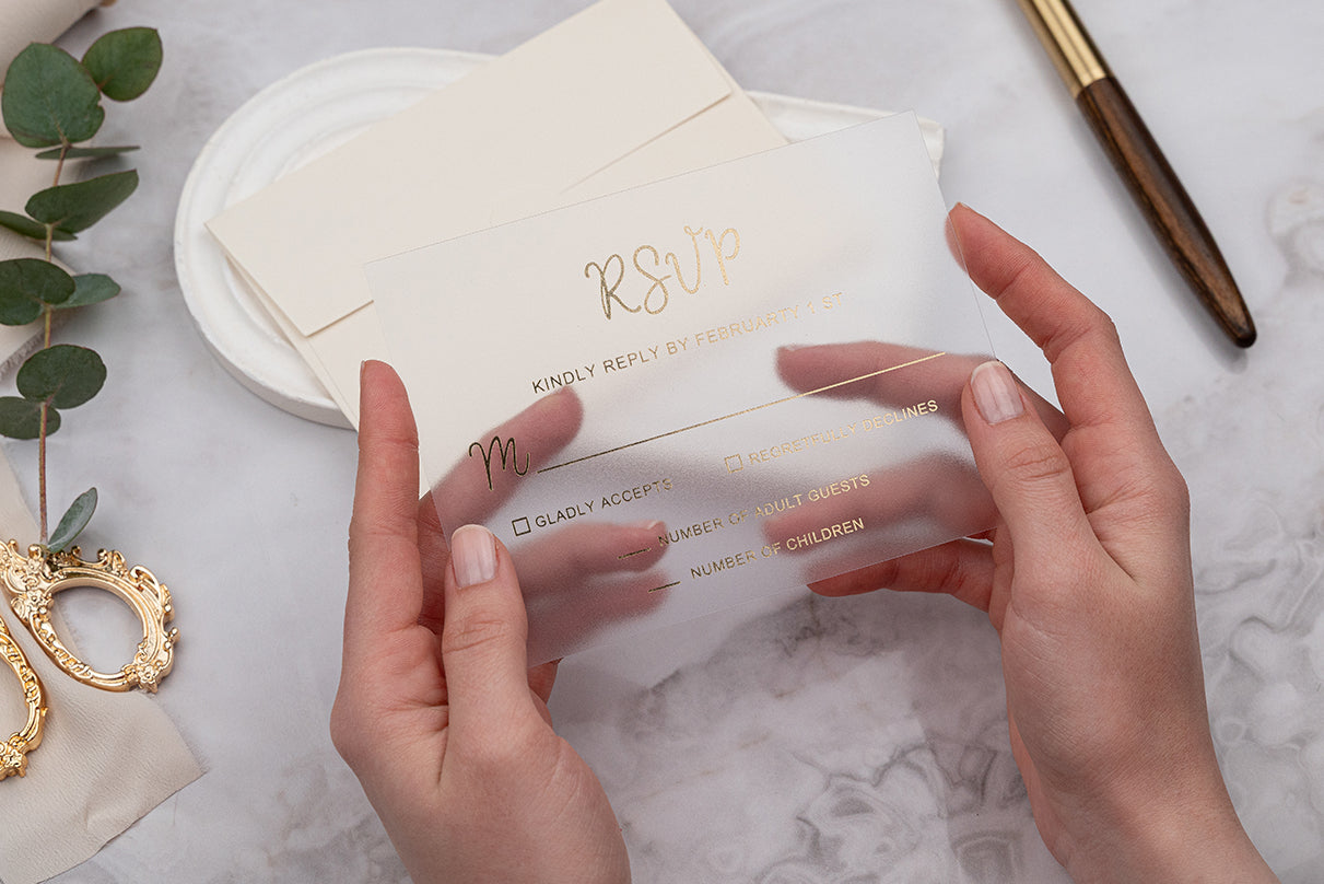A perfect complement to your wedding invitations, this mini RSVP card features a frosted transparent overlay and a cream base card with gold foil printing. Its compact design makes it easy for guests to confirm attendance and meal preferences, adding a touch of elegance to your wedding stationery set.
