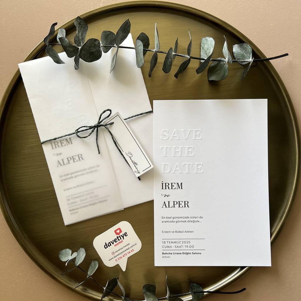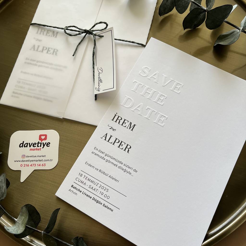 Design: Embossed "SAVE THE DATE" title with modern typography