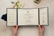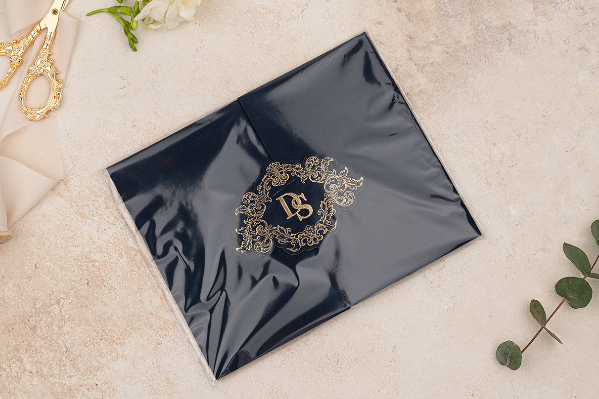 This luxury wedding invitation showcases timeless elegance with its deep navy blue cover, adorned with an intricate gold foil monogram emblem. Designed for couples who desire sophistication and grandeur, it creates a lasting first impression for your guests.