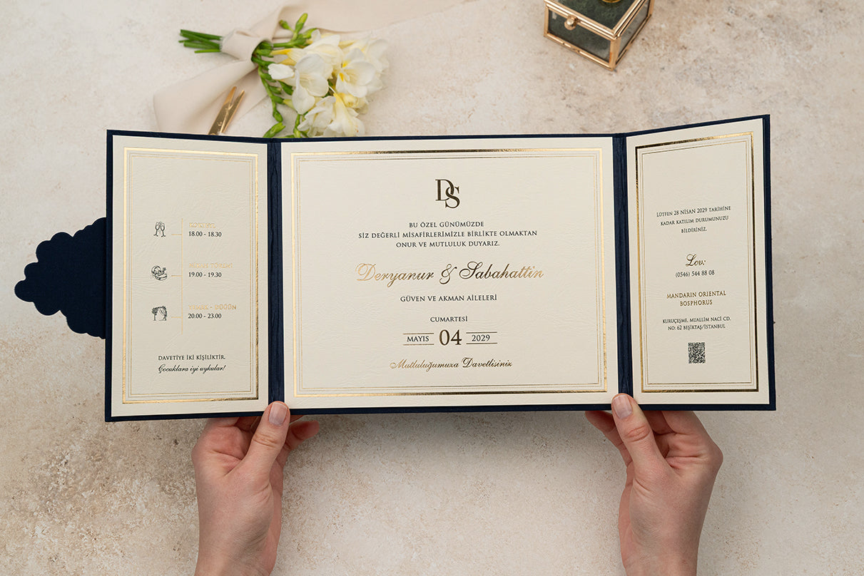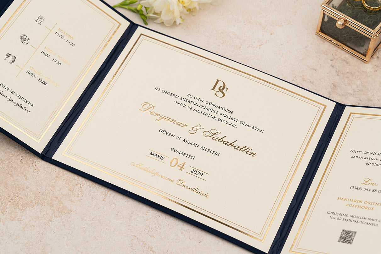 Elegant Navy Blue Wedding Invitation with Gold Foil Monogram – Premium Folded Design