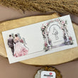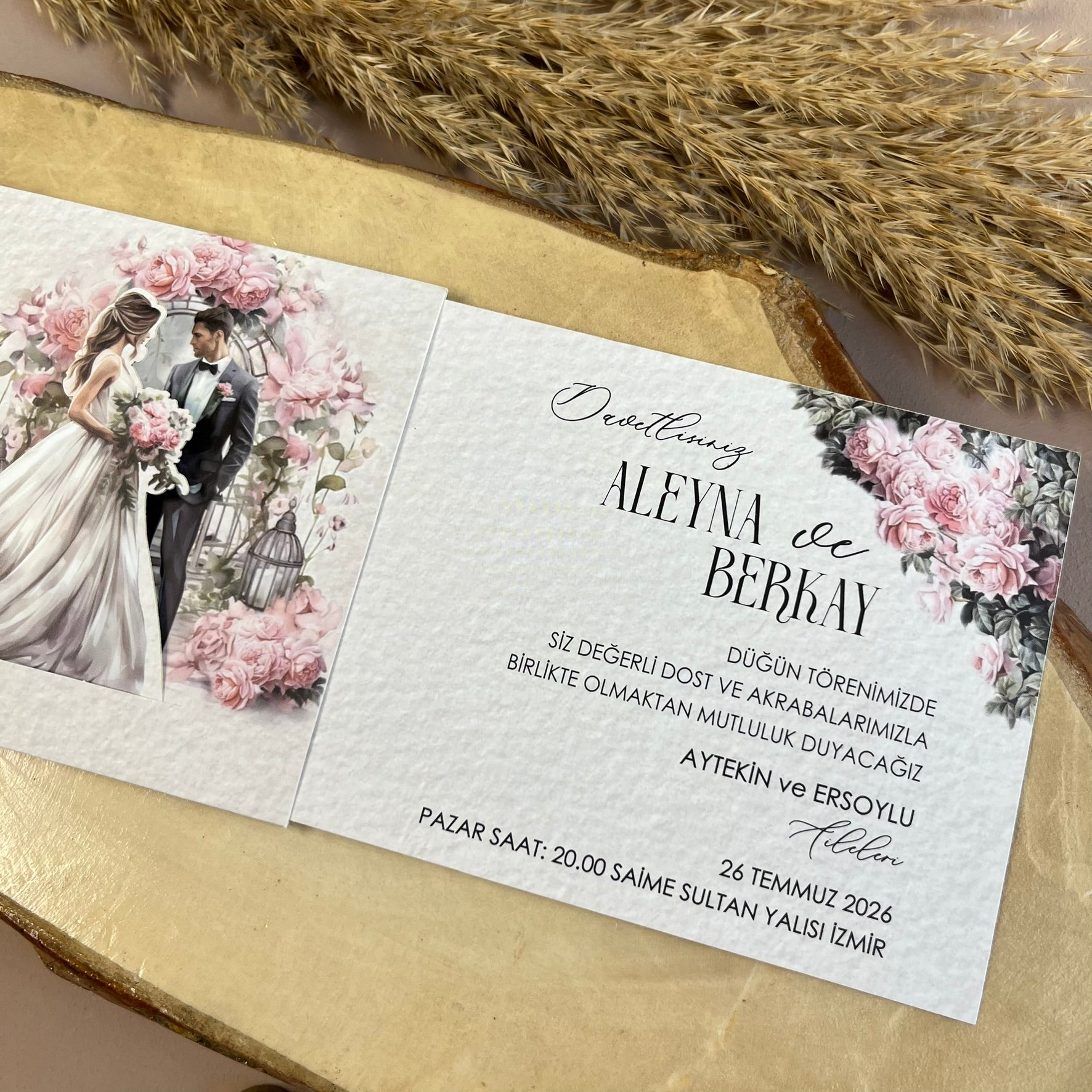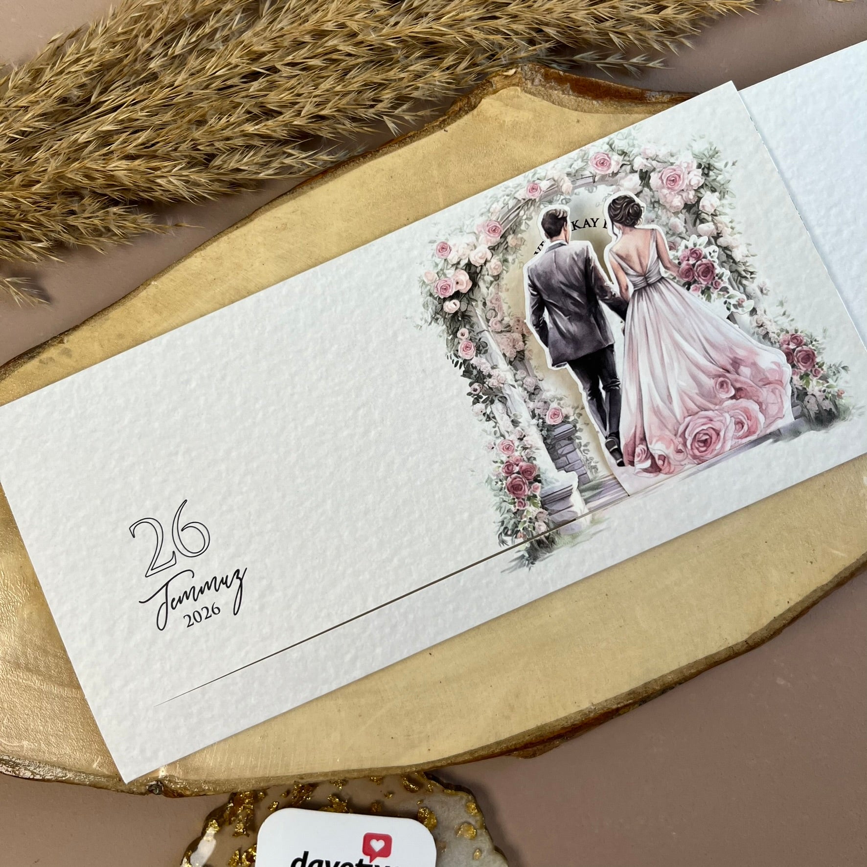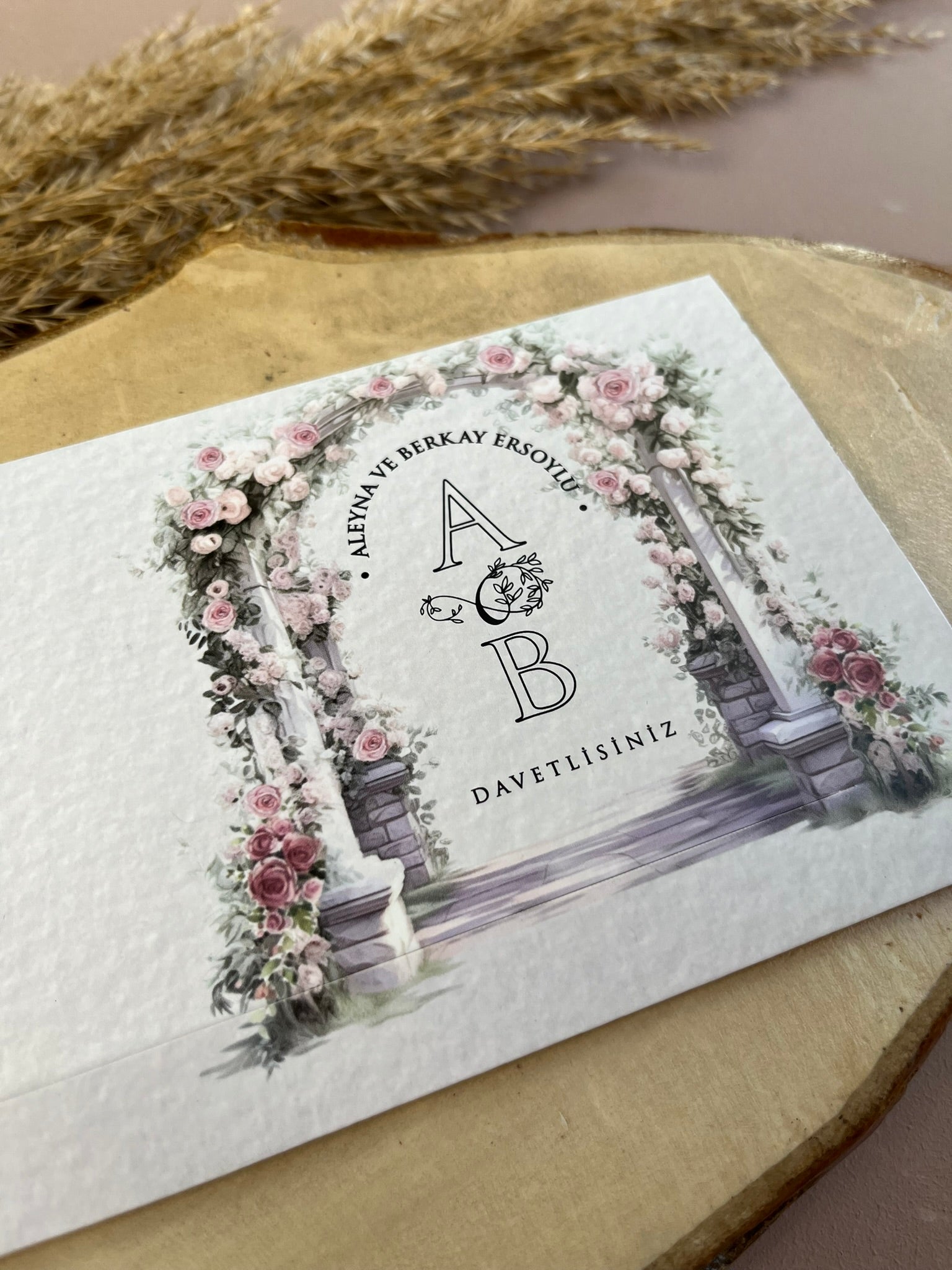 Invite your guests to your special day with this stunning wedding invitation, designed with a dreamy floral arch and a walking bride & groom illustration. The soft pink roses, watercolor textures, and textured cardstock create an enchanting and romantic look. This elegant design symbolizes stepping into a new life together — perfect for couples who appreciate classic beauty with a modern touch.