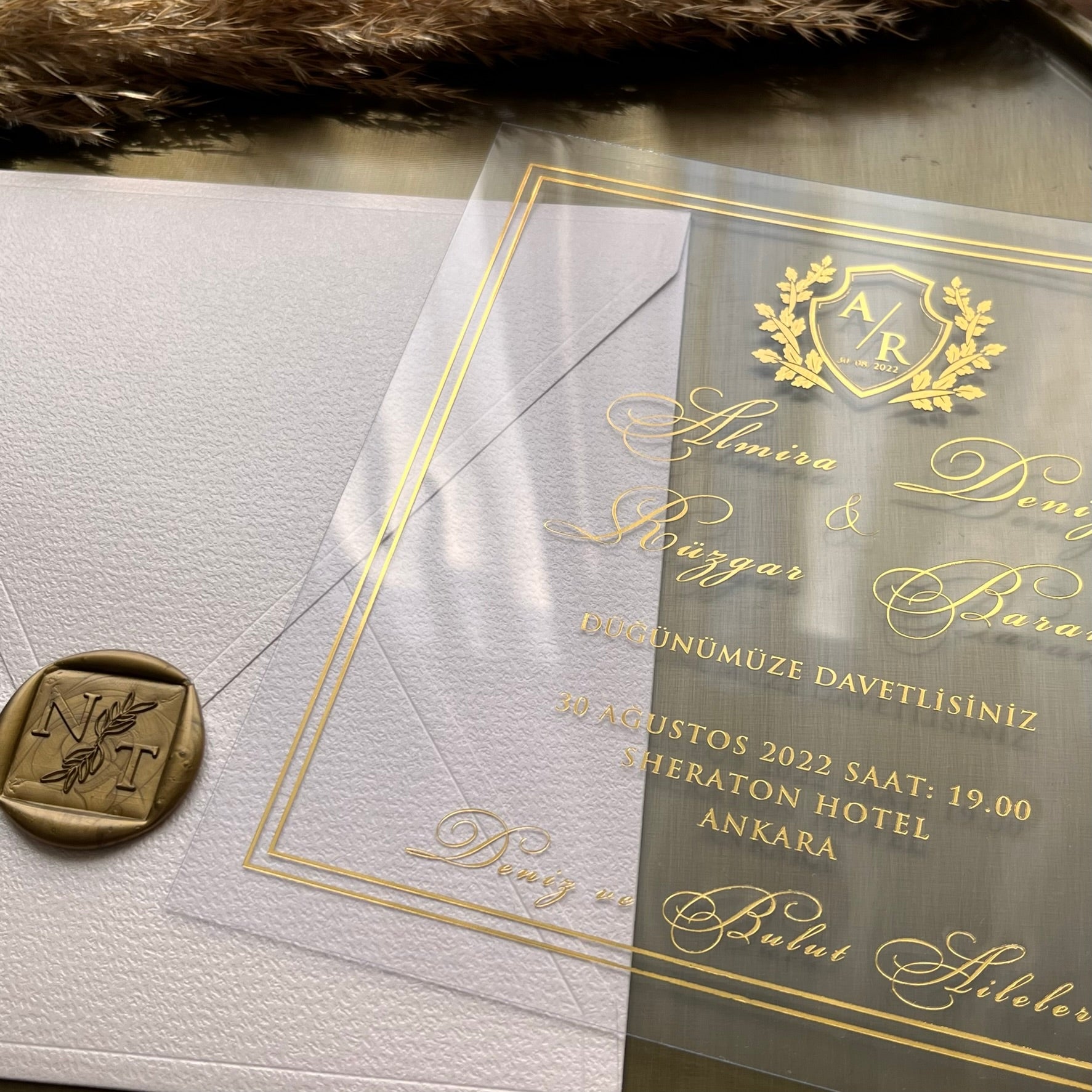 Timeless sophistication meets modern luxury in this exquisite clear acrylic wedding invitation. Featuring radiant gold UV printing and paired with a white textured envelope sealed with a gold monogram wax seal, this piece is designed to impress from the very first glance.