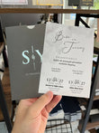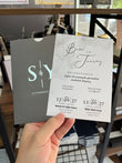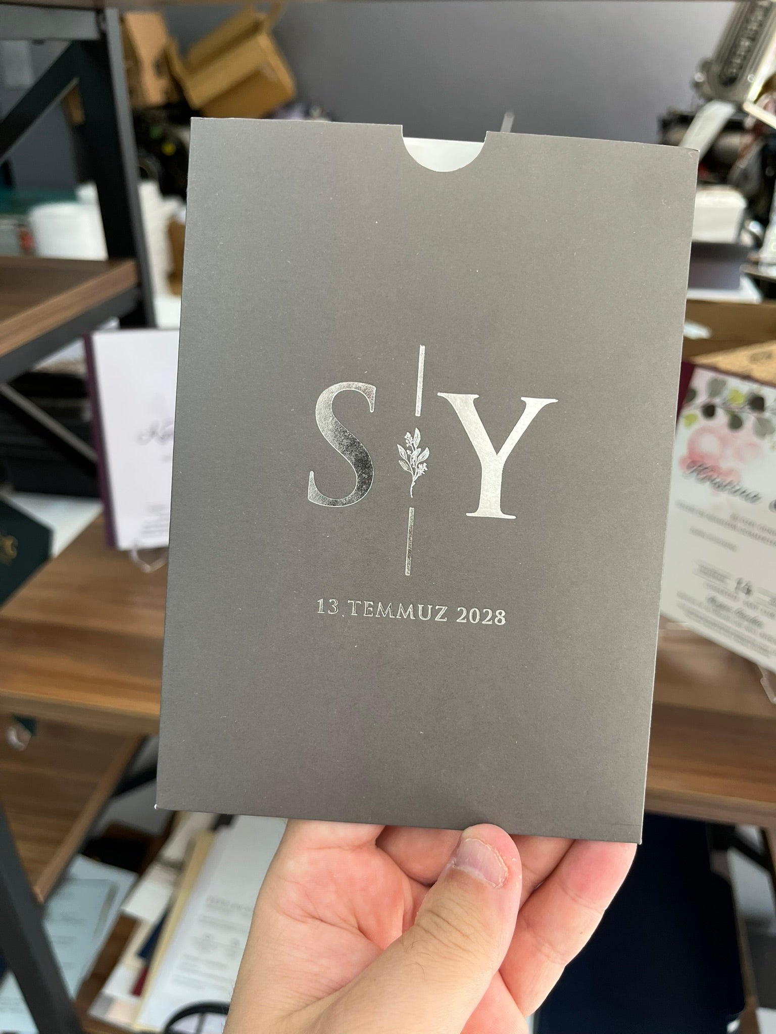 The sleeve is crafted from premium matte gray cardstock and finished with silver foil stamped initials and date, giving it a high-end look and feel. This contrast between cool tones and metallic shine makes it ideal for urban, modern, or evening weddings.