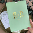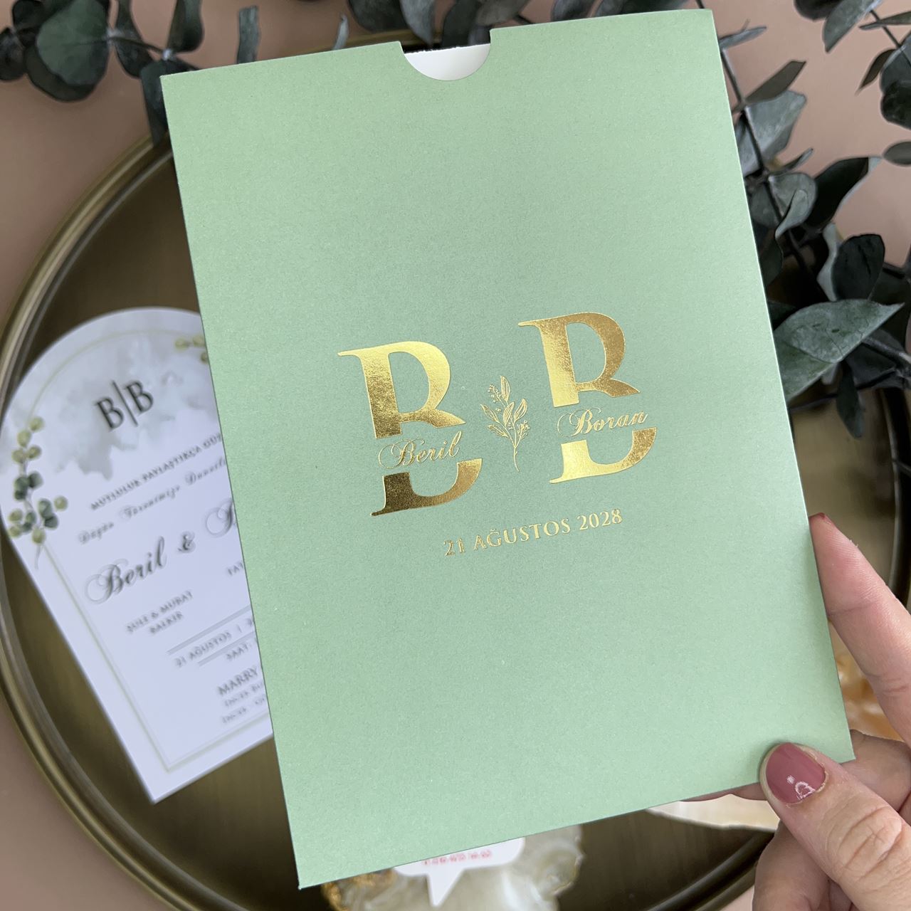 Add a refreshing botanical flair to your wedding with this elegant green invitation set, featuring a soft green envelope with luxurious gold foil monogram and a beautifully arched invitation card decorated with watercolor eucalyptus accents.