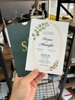 The inner card features a beautifully curved eucalyptus branch design complemented by delicate gold oval line accents, representing unity and growth. The names of the couple stand out in graceful script, while all the wedding details are arranged cleanly and clearly.