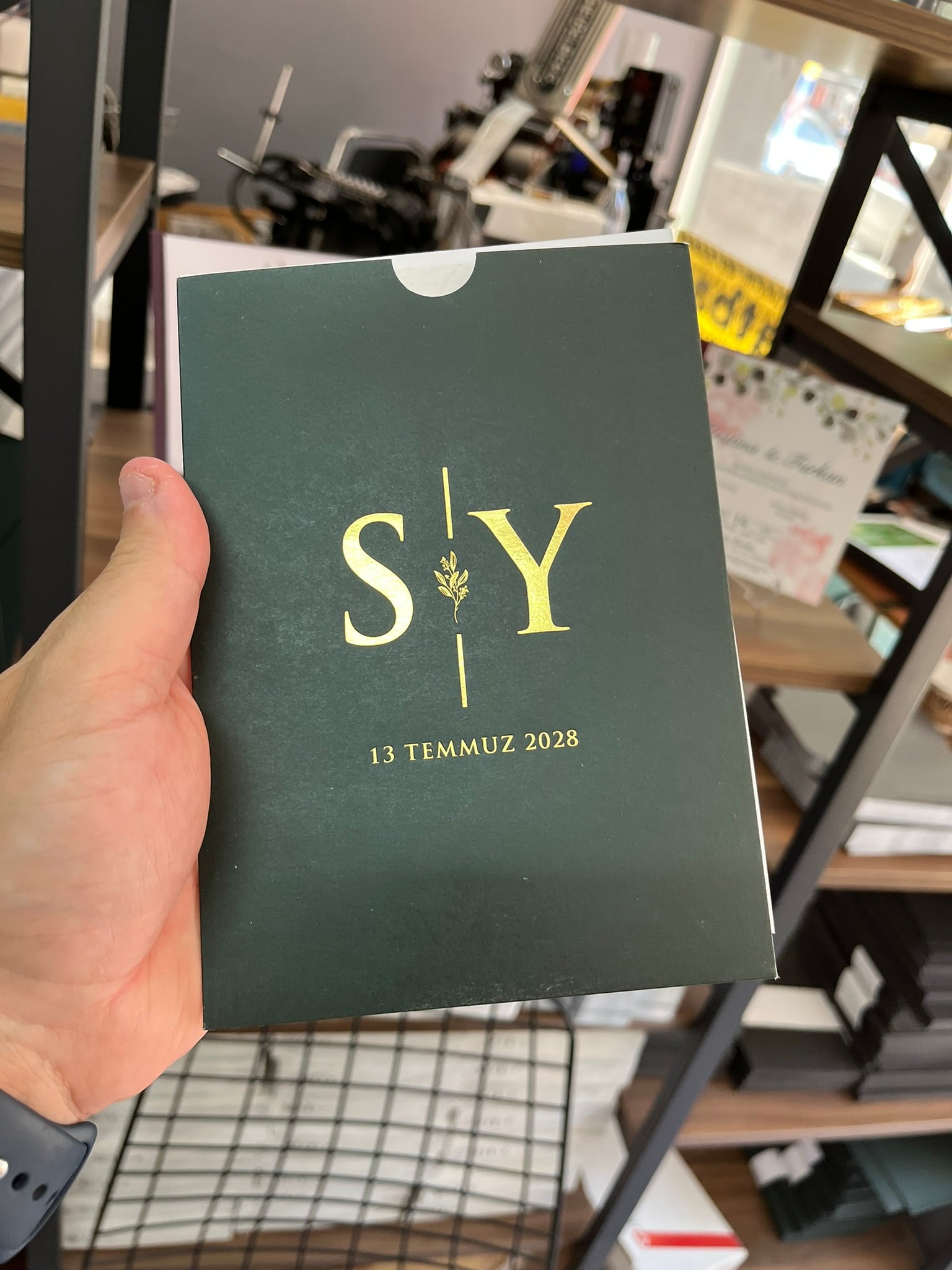 This 12x17 cm wedding invitation brings a fresh and refined touch to your special day. Housed in a deep forest green envelope with radiant gold foil initials, this invitation sets the tone for a sophisticated and memorable event.
