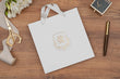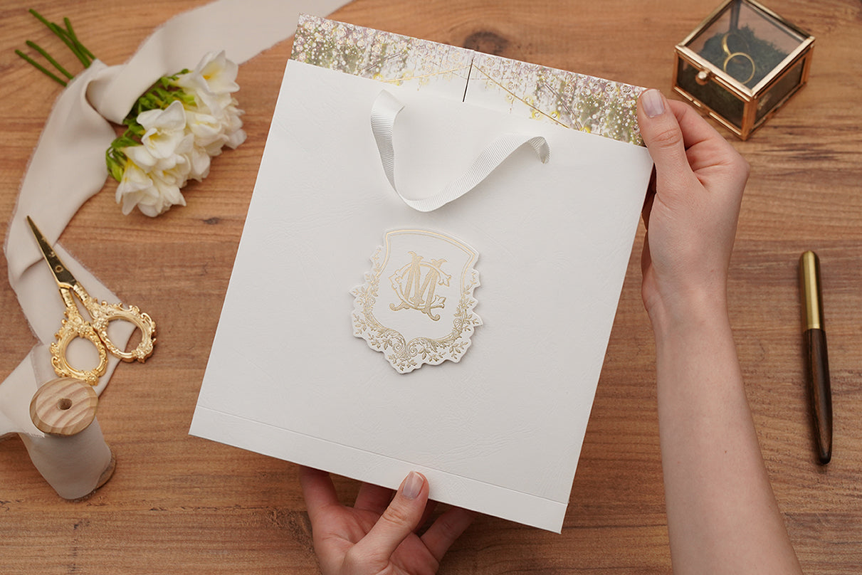 Each invitation is presented in a coordinated ivory bag with satin ribbon handles. The front of the bag showcases the same embossed monogram emblem for cohesive luxury.