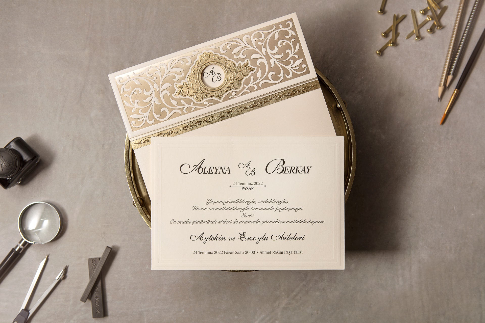📩 Envelope: Velvet-textured sleeve with gold foil ornamental window