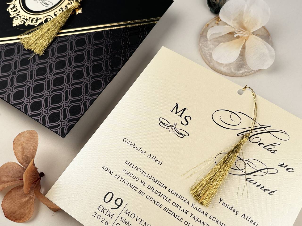 Luxury Black & Gold Wedding Invitation with Tassel – Classic Royal Design