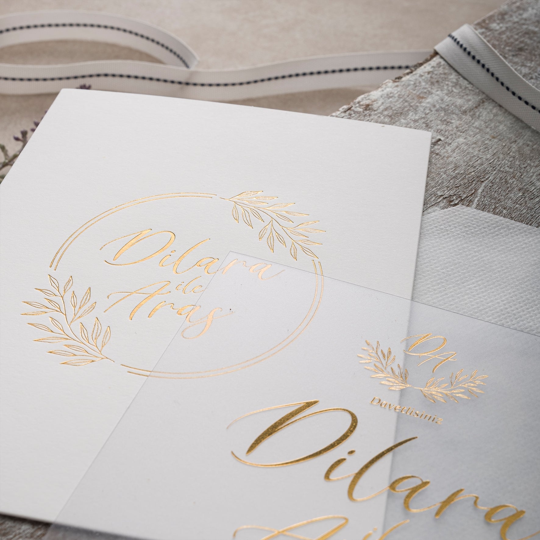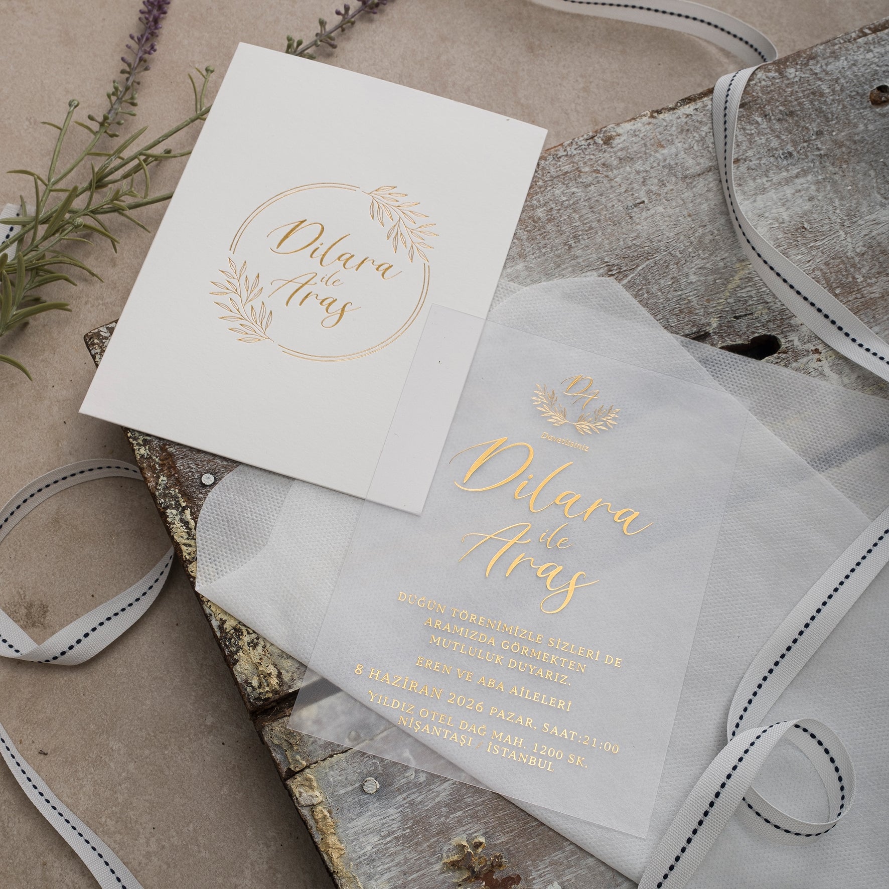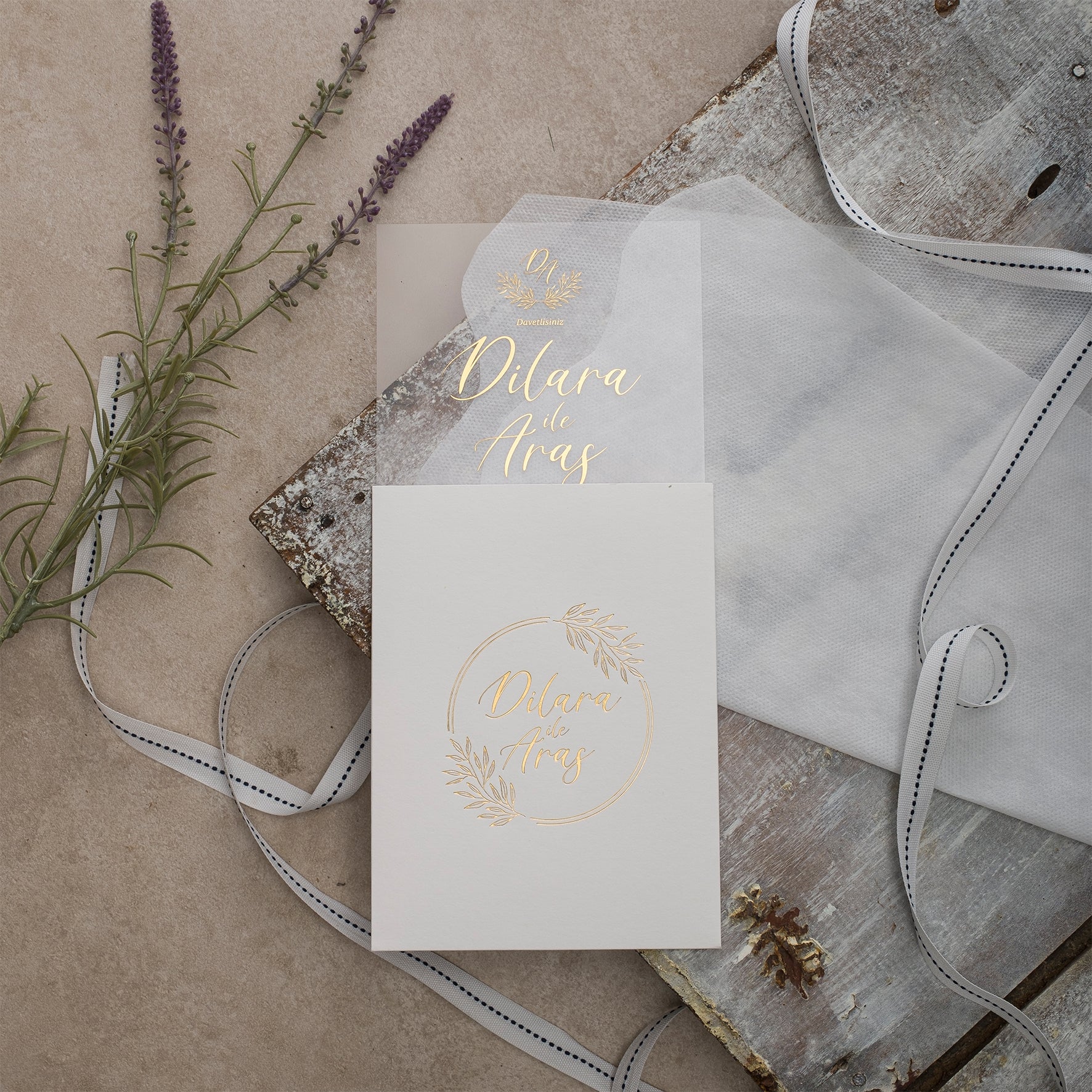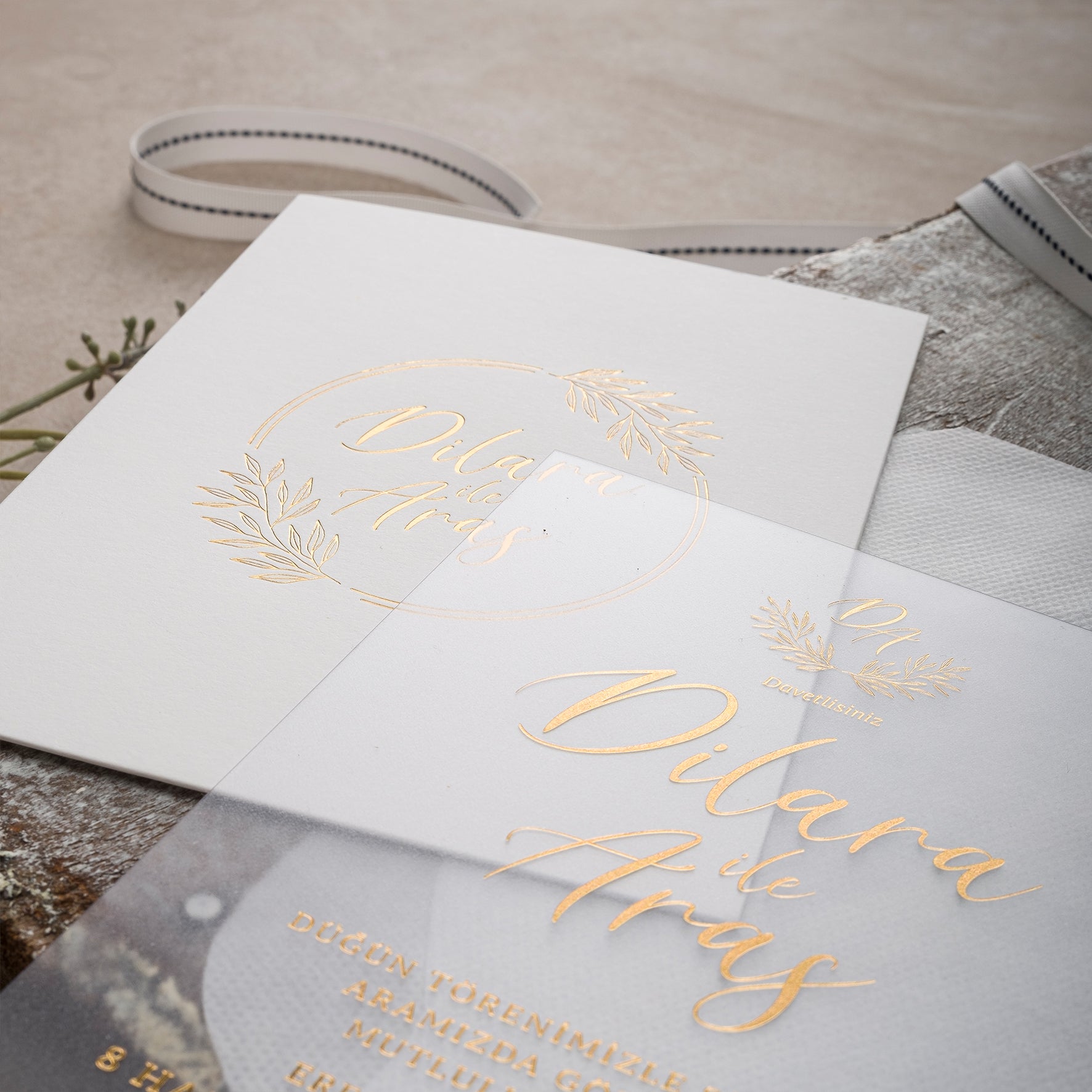 Impress your guests with this luxurious transparent acrylic wedding invitation, featuring elegant gold foil typography and a sleek modern design. The see-through card adds a unique and stylish touch, while the high-quality envelope with gold-stamped names ensures a refined presentation.