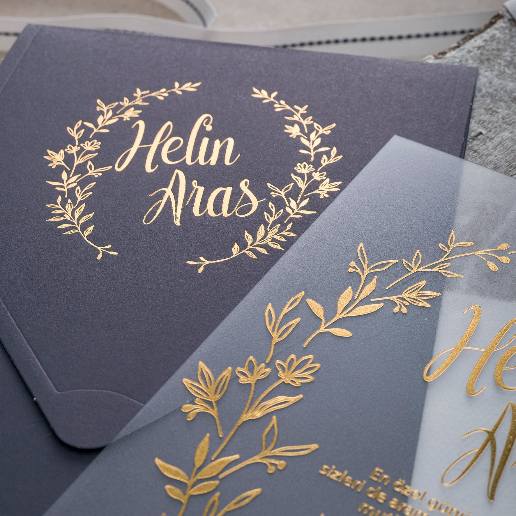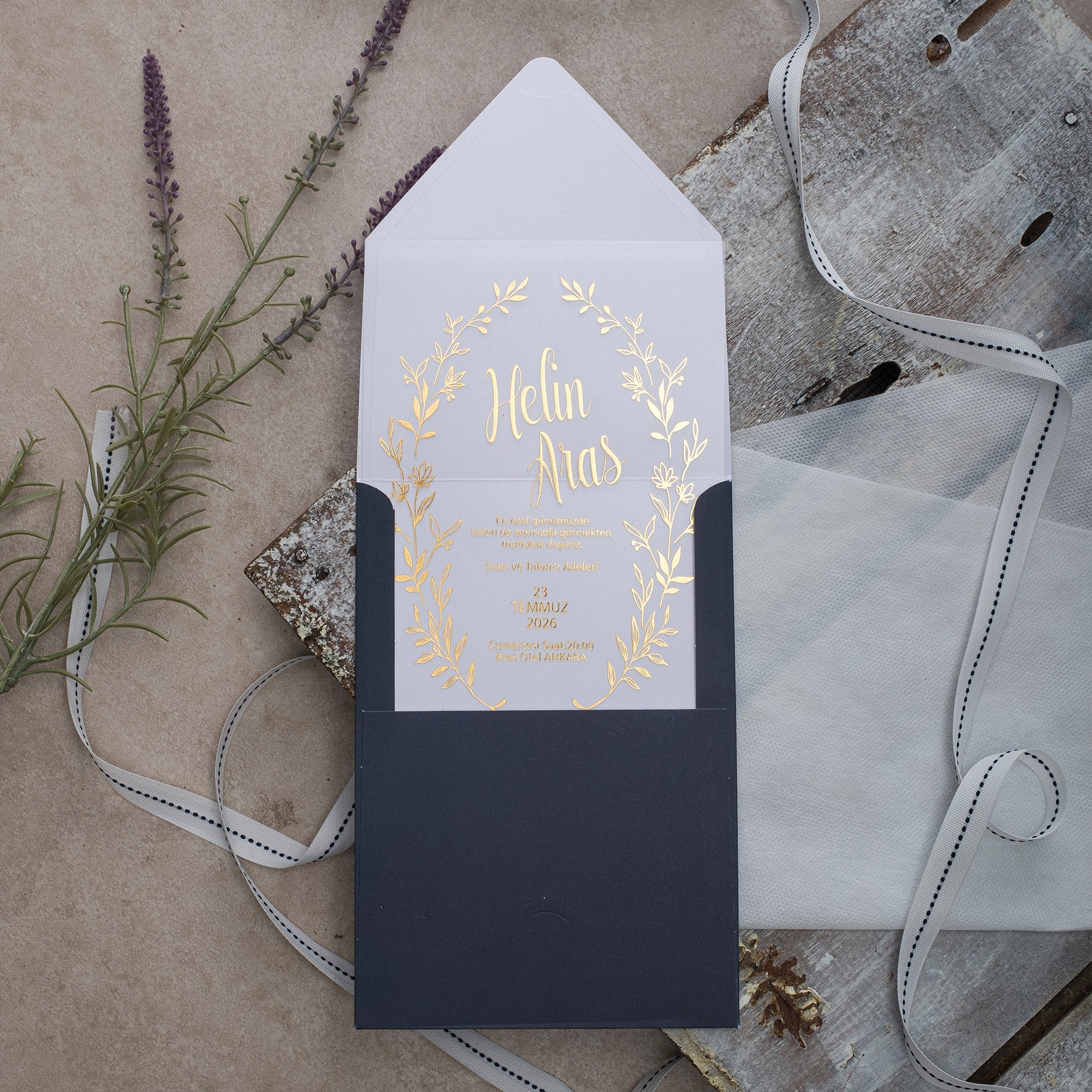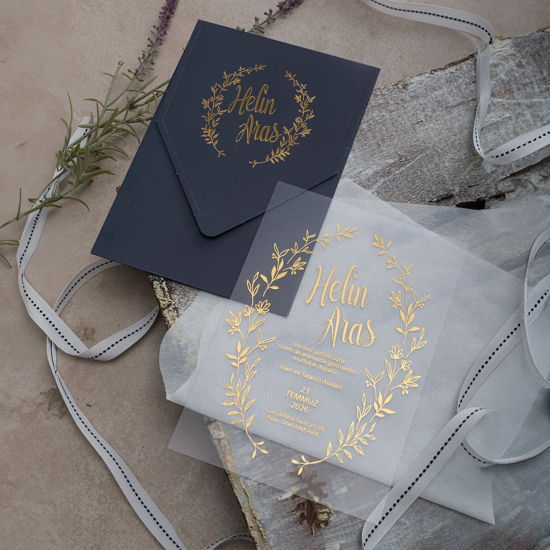 Add a touch of luxury to your special day with this transparent acrylic invitation. Featuring a gold foil botanical wreath and modern typography, this design is the ultimate statement piece for elegant weddings.