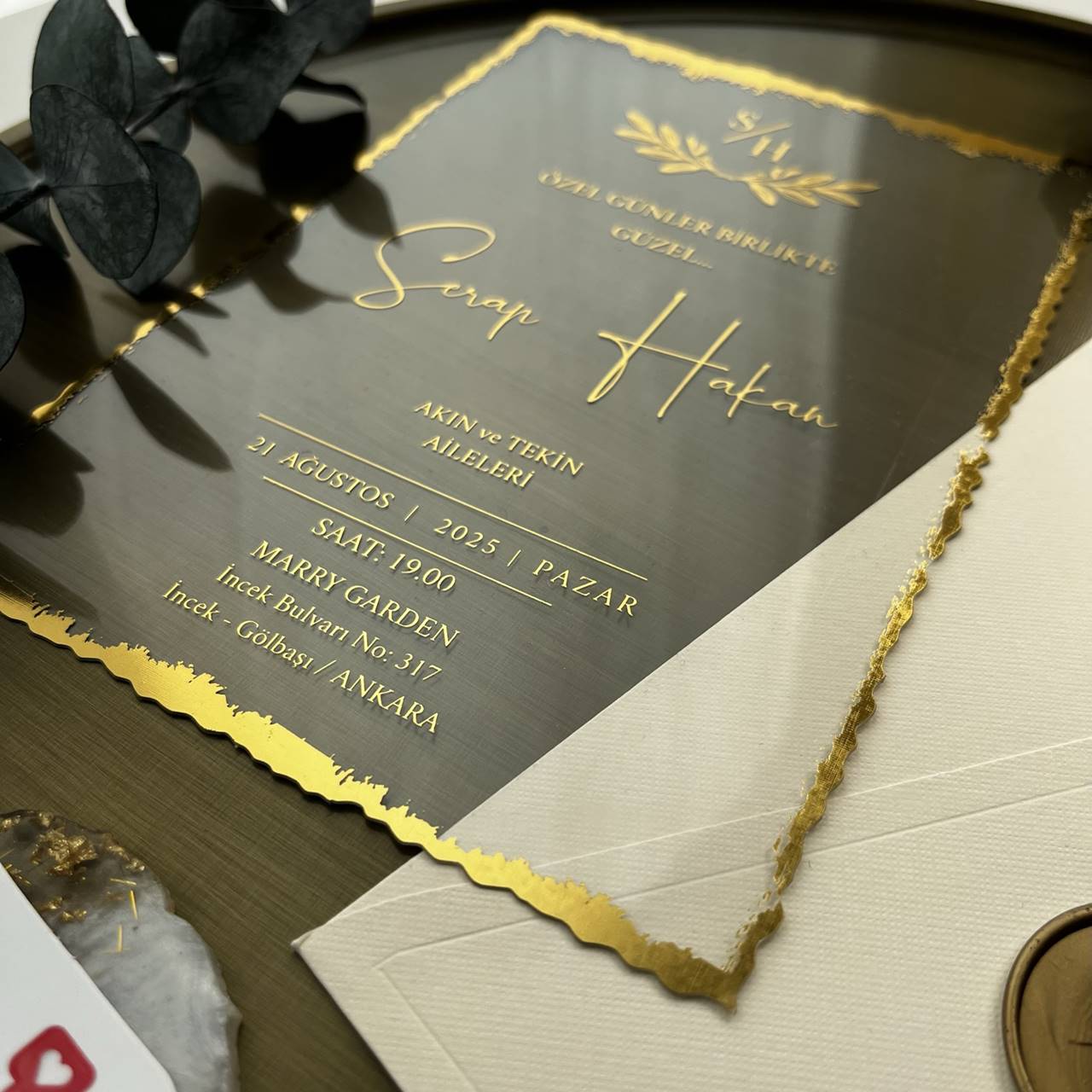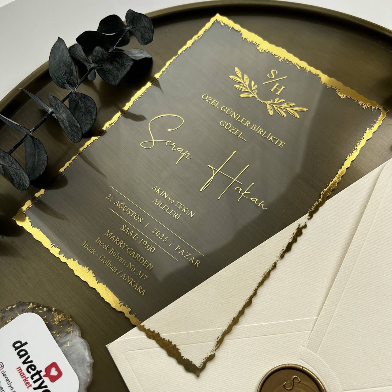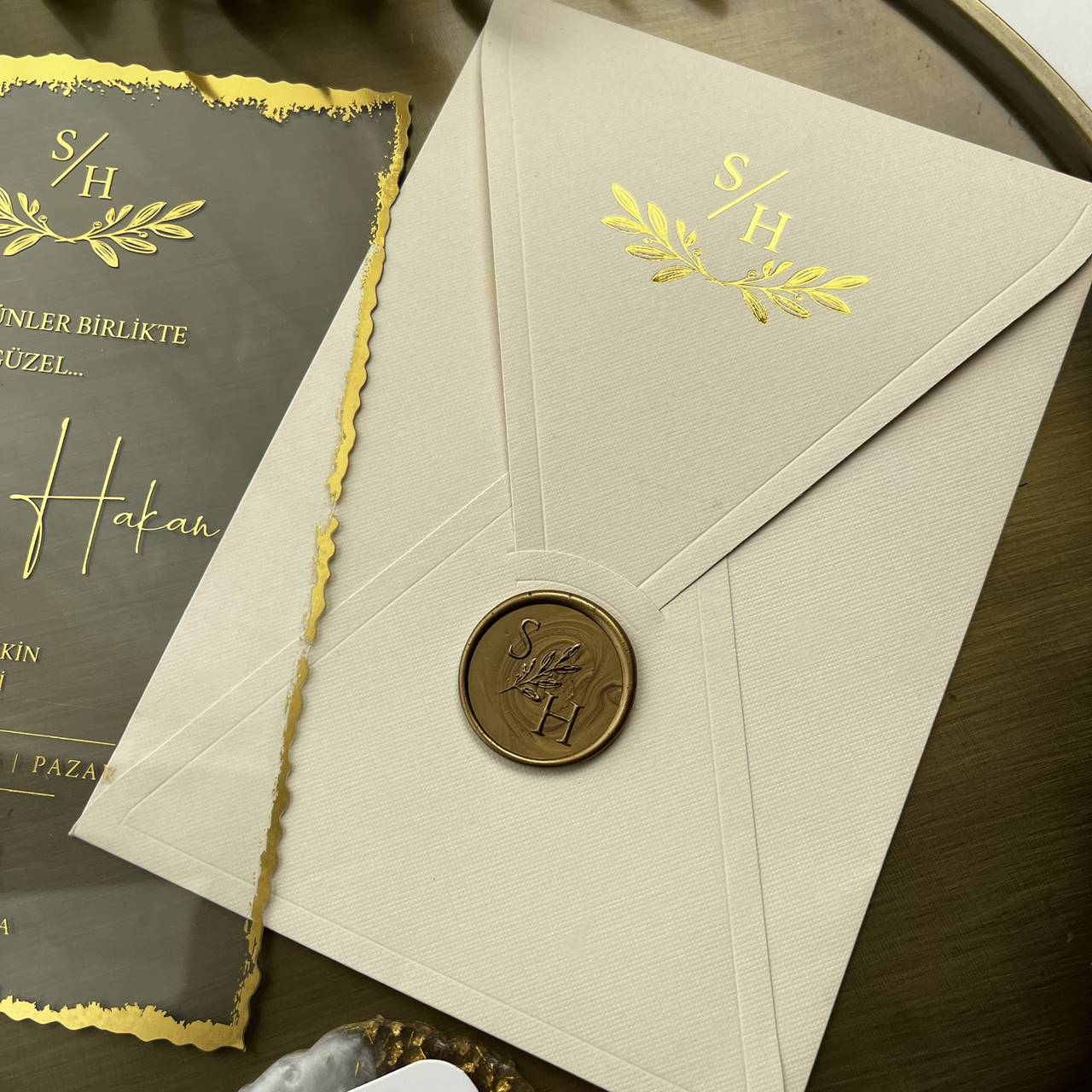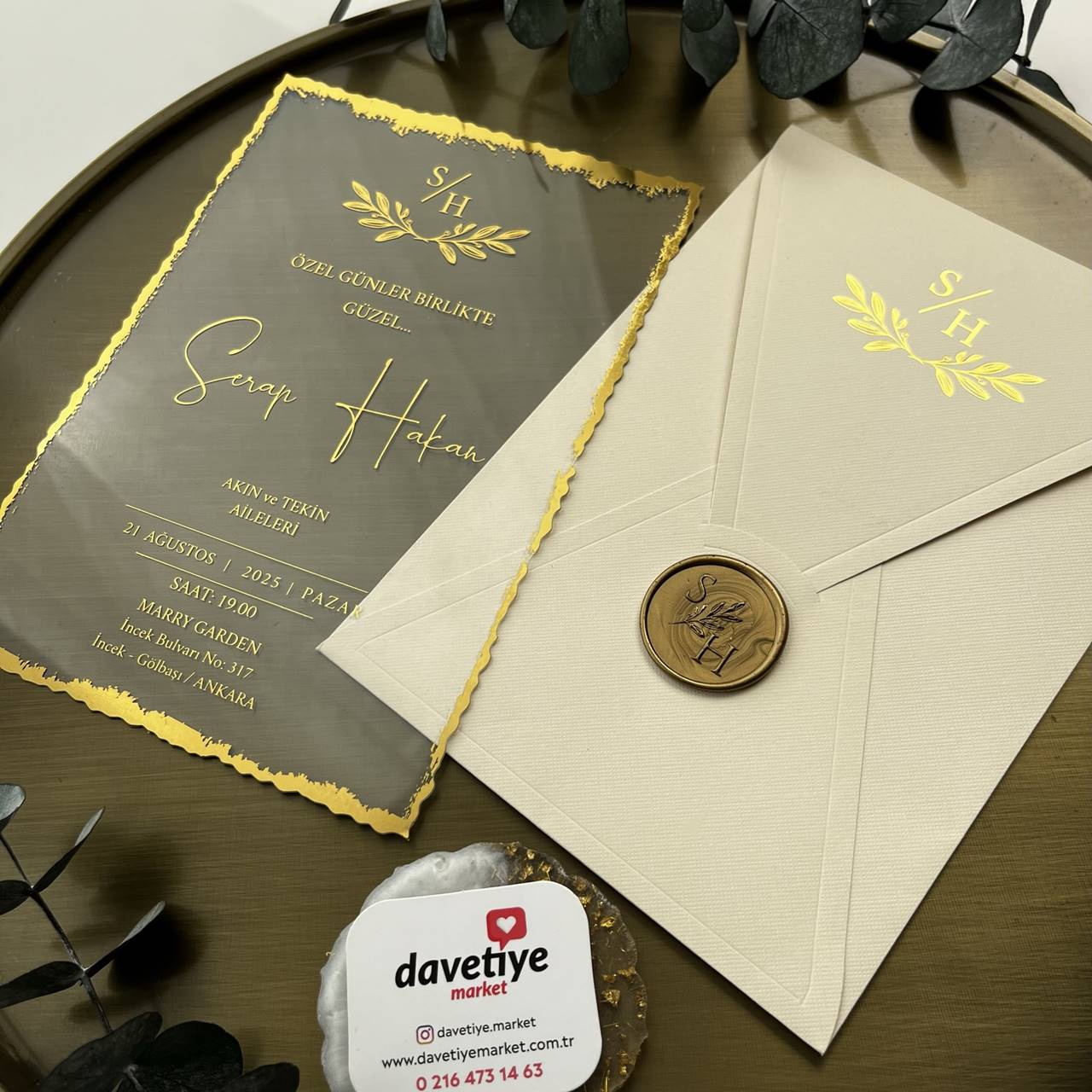 Introducing a wedding invitation that exudes prestige and timeless style β our transparent acrylic-style card with radiant gold foil detailing. The fine, scalloped edge glistens with rich metallic gold, providing a regal frame to your wedding details. Paired with a cream-colored envelope adorned with a matching gold foil monogram and finished with a luxurious wax seal, this design is perfect for high-end weddings and stylish couples.