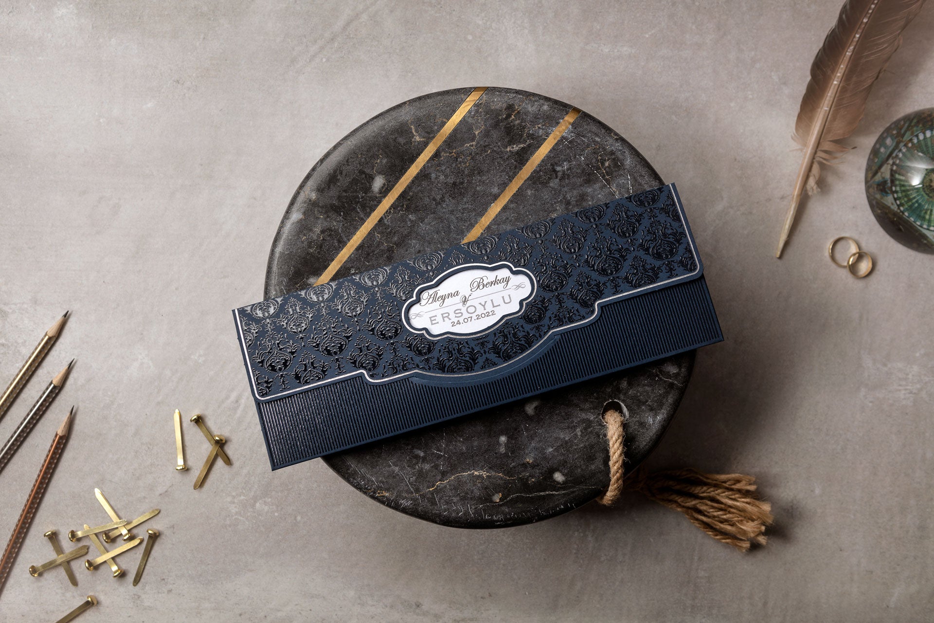 Perfect for couples seeking a bold and luxurious statement. The embossed navy sleeve and peek-through frame elevate this invitation into a truly memorable first impression.