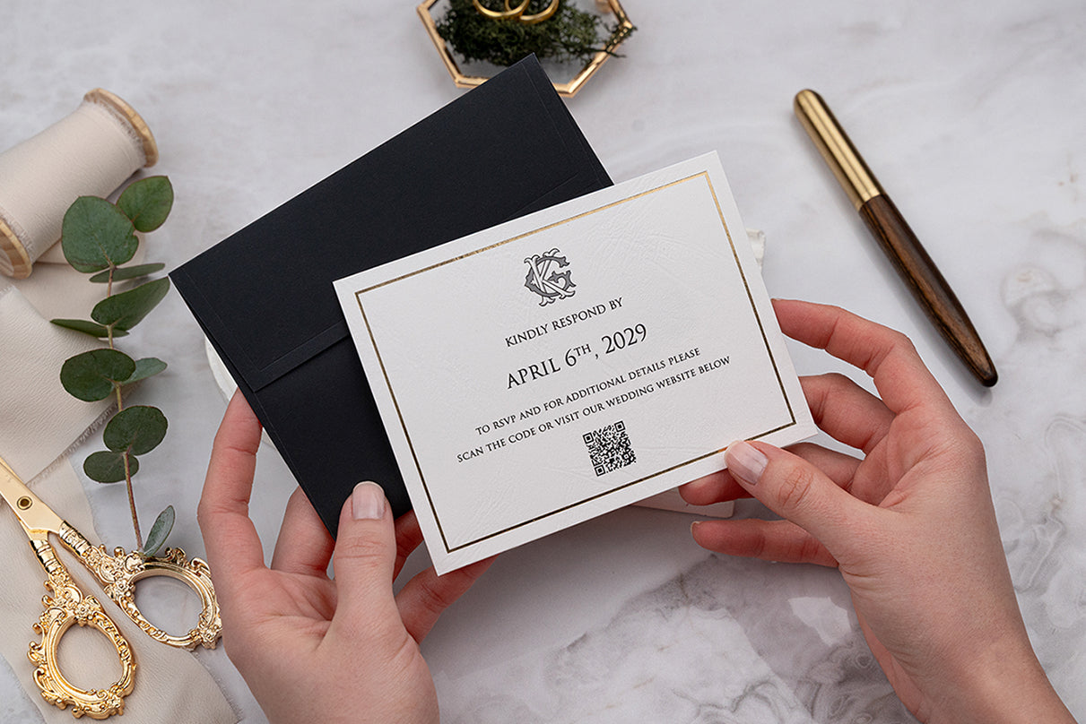 📜 Functional & Modern – Includes a clear RSVP date, elegant typography, and a QR code for guests to respond quickly and access your wedding details online.