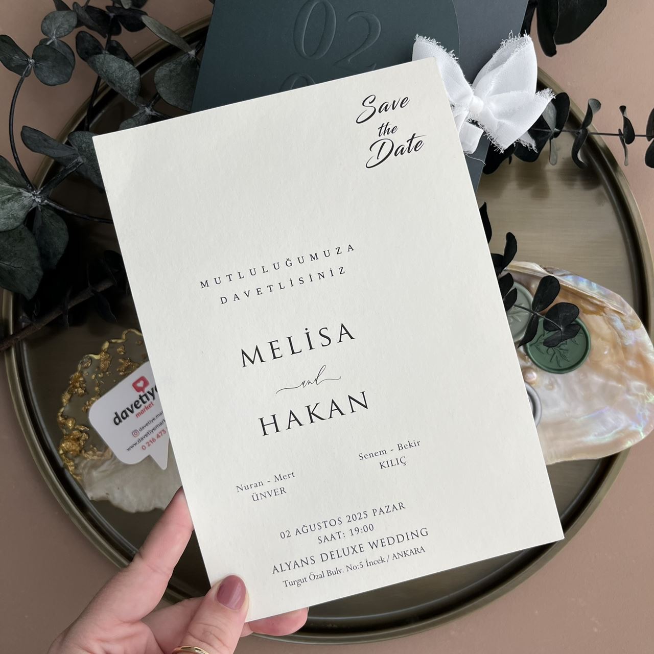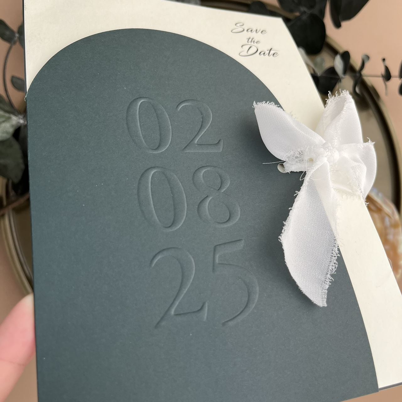 Ivory backing card with โSave the Dateโ printed in elegant script