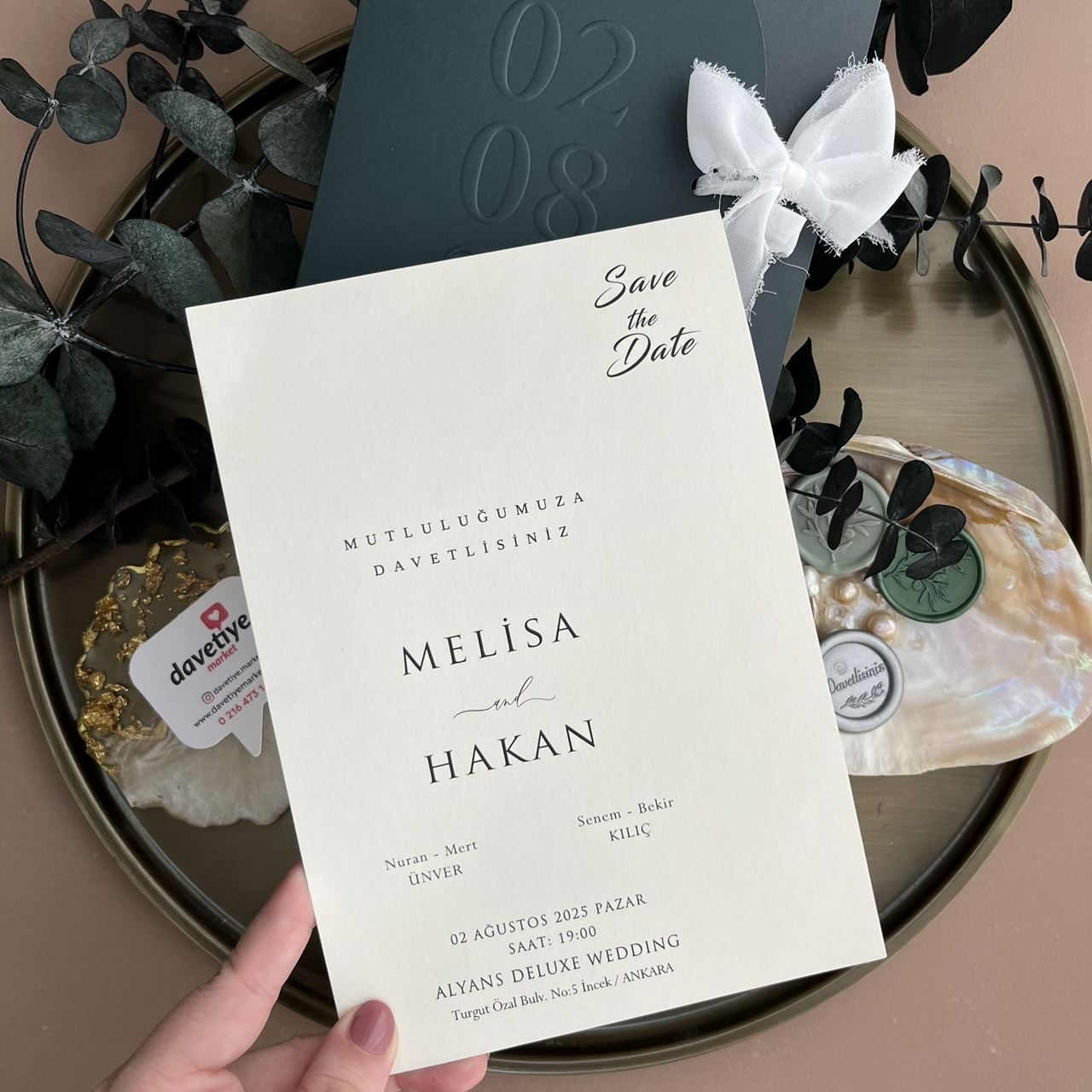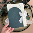 Deep green card with embossed wedding date (02.08.25)