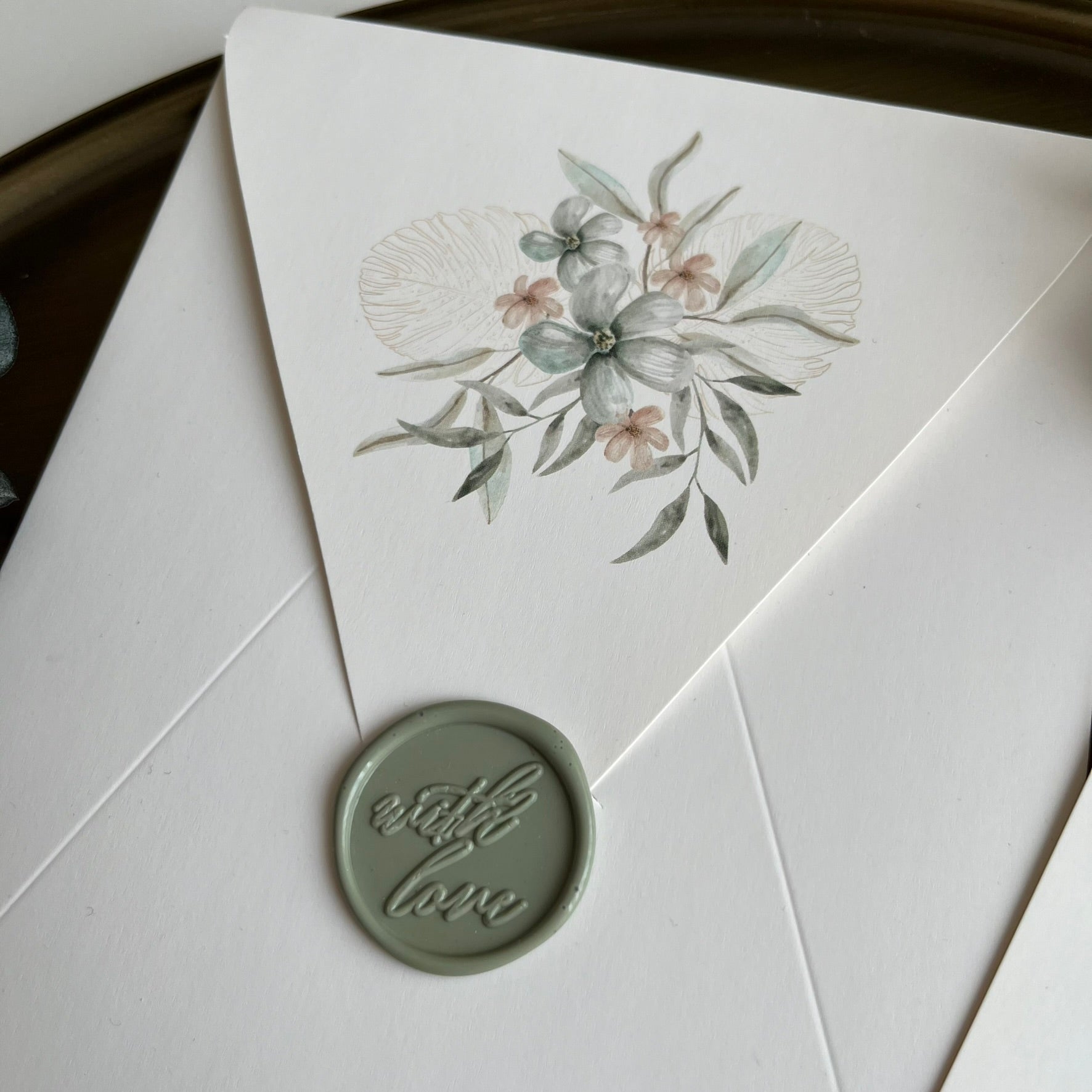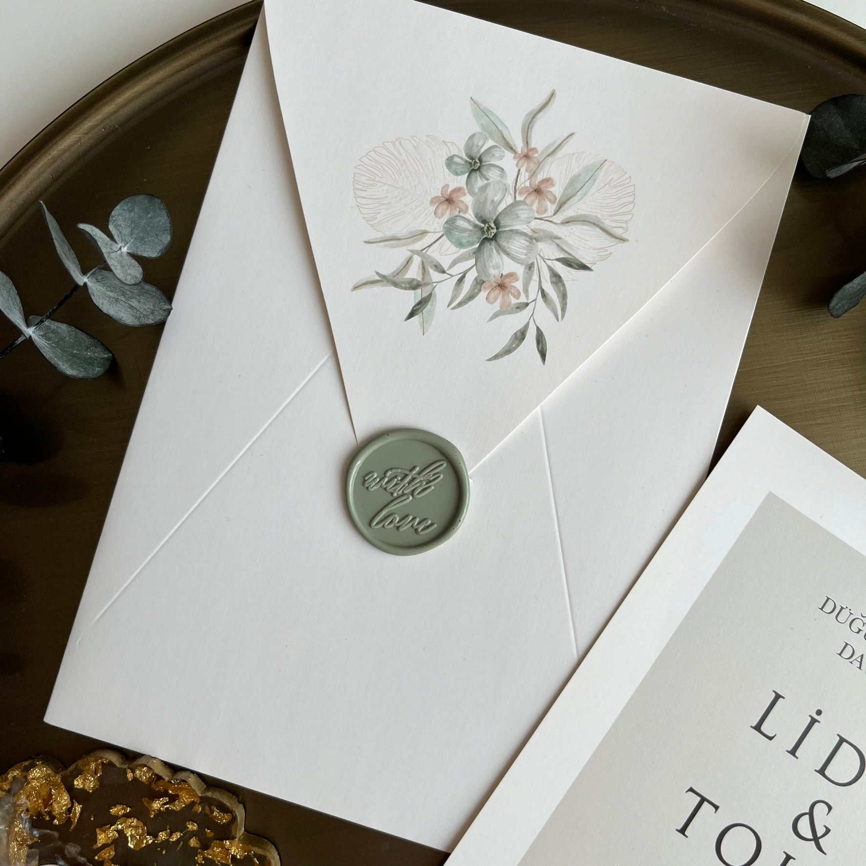 Each invitation comes with a premium white envelope adorned with a soft floral illustration and sealed with a sage green wax stamp that reads "with love". This touch adds an extra layer of charm and elegance to your wedding stationery.