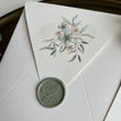 Envelope: White premium envelope with floral illustration and sage green wax seal