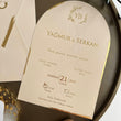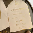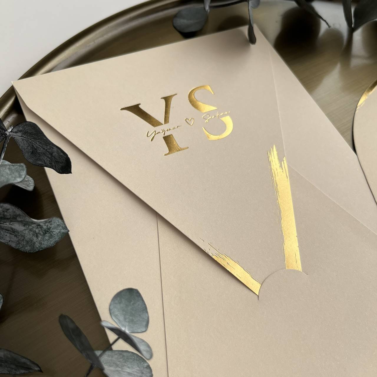 The matching cream envelope is adorned with a sleek "YS" monogram and an abstract gold brushstroke finish that perfectly frames the design. The delicate embossing on the card adds texture and luxury, while the gilded edges enhance the premium feel. Ideal for modern weddings that value both style and substance.