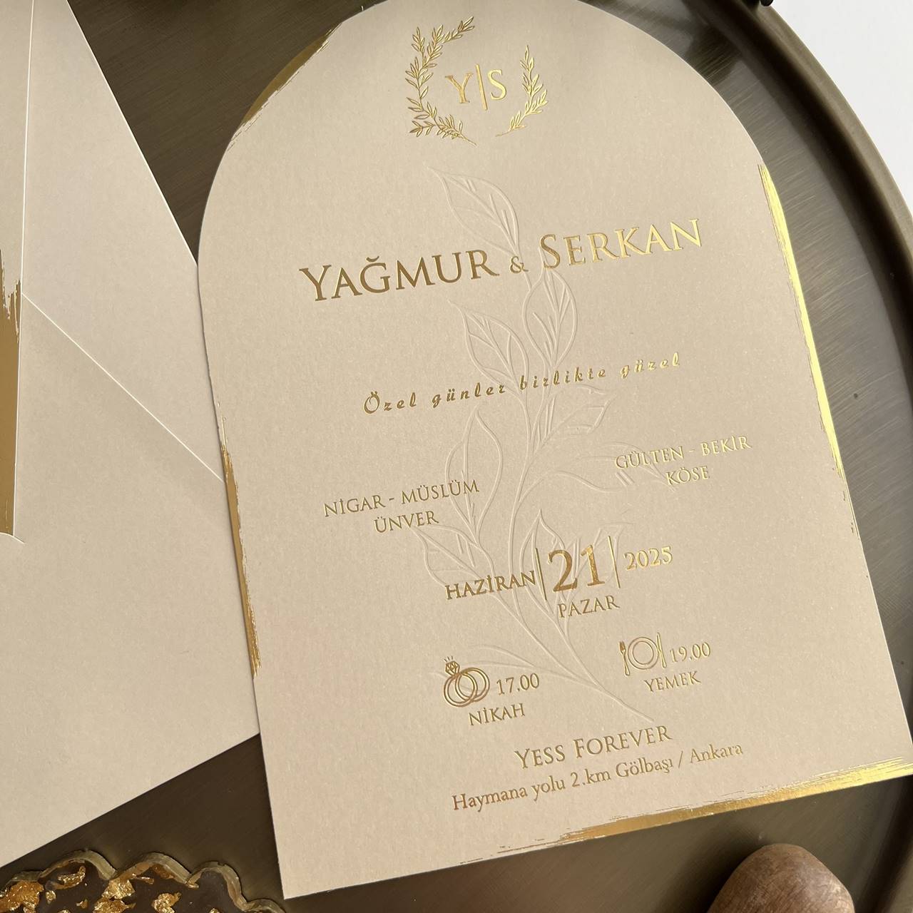 Add a touch of timeless sophistication to your big day with our Modern Cream Arched Wedding Invitation. Featuring a gracefully arched card in warm cream tones, complemented by elegant gold foil details and soft botanical embossing, this invitation is designed to impress.