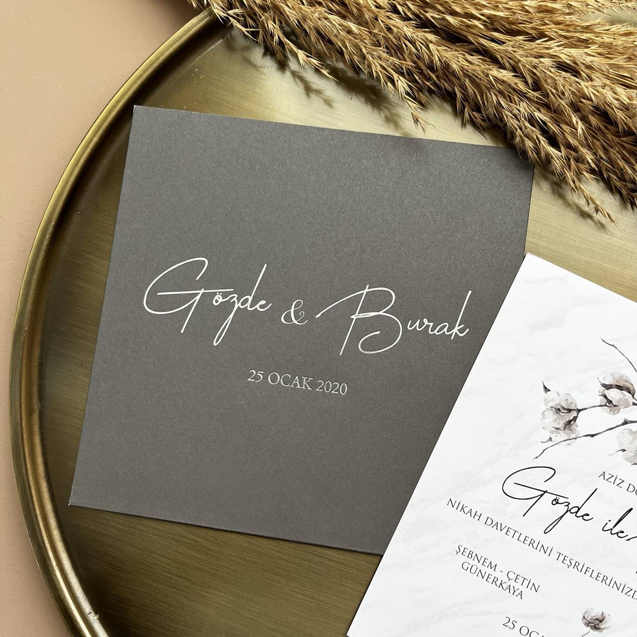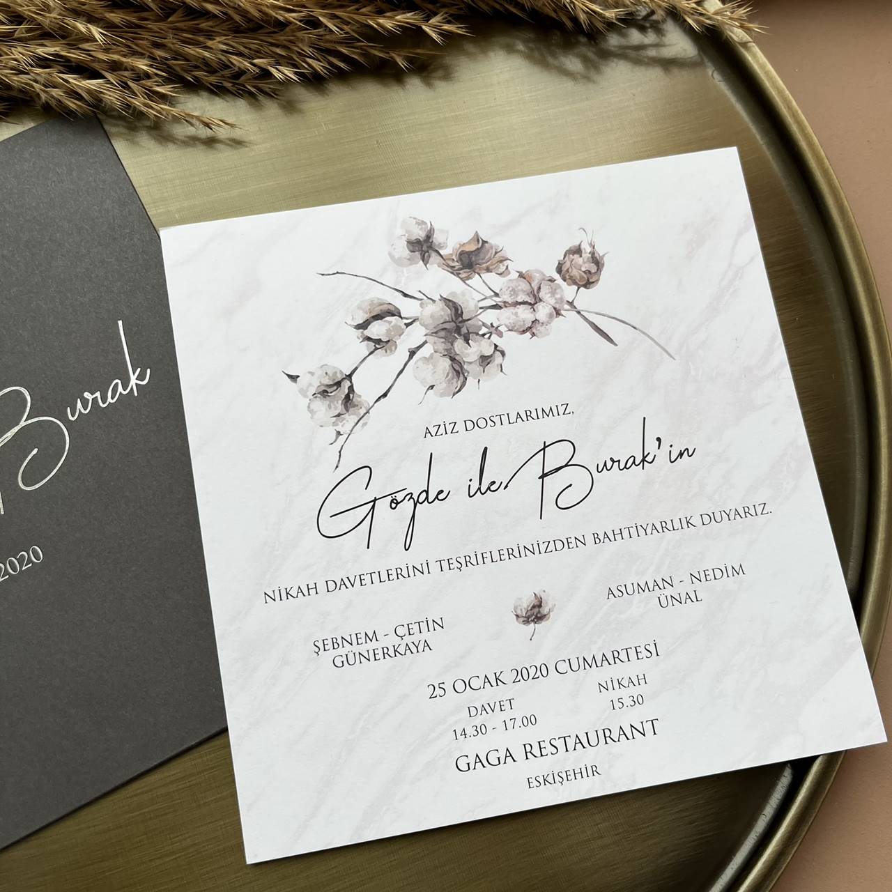Elegant and minimal – this square wedding invitation features a stylish gray envelope and a floral-themed inner card with a soft marble background. The romantic handwritten font paired with cotton flower illustrations gives it a modern yet natural charm.