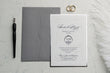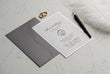 Paired with a textured gray envelope, the invitation arrives in a sleek, sophisticated style, suitable for formal and high-end weddings. The neutral tones and modern typography make it versatile and appealing for various wedding themes—from minimalist city weddings to luxury hotel celebrations.