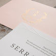 Blush pink envelope with monogram crest & foil print