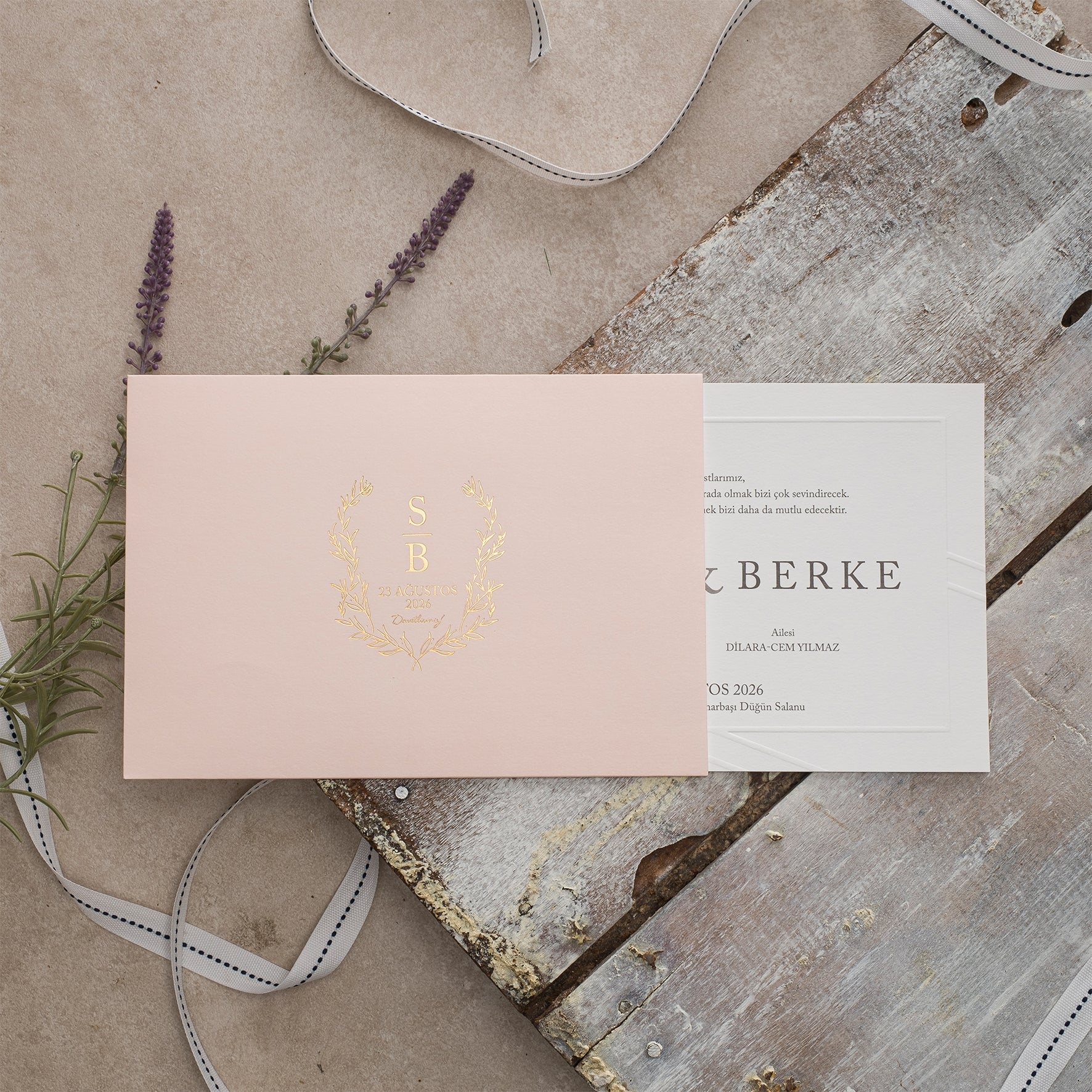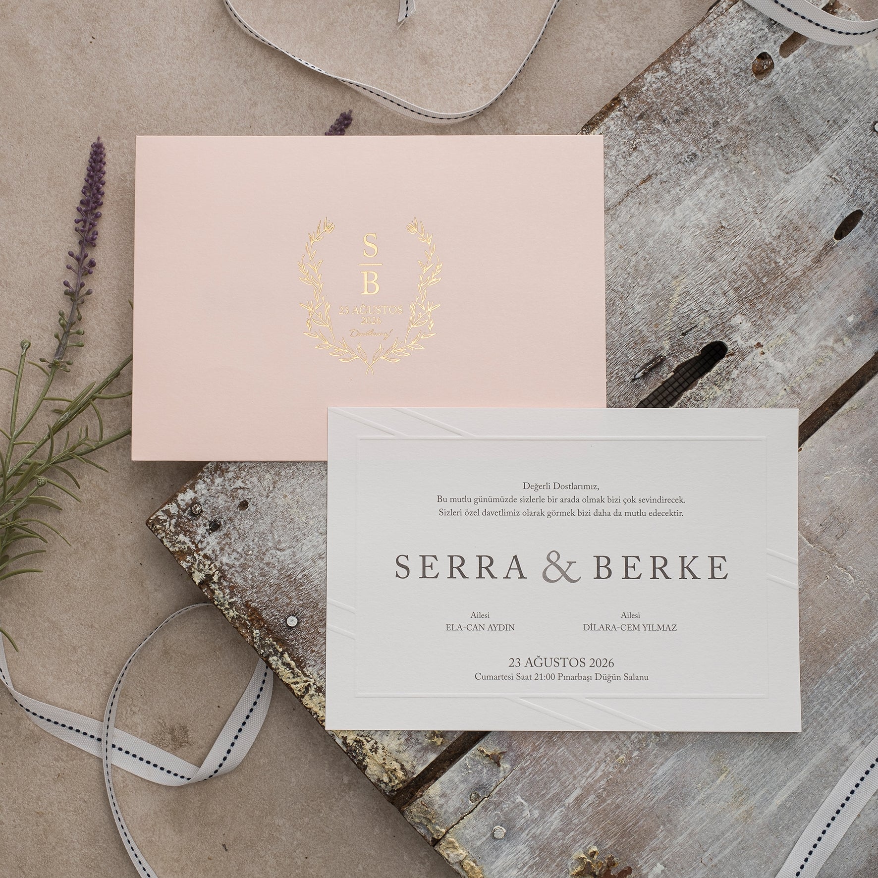 Modern Wedding Invitation with Blush Envelope & Embossed Details