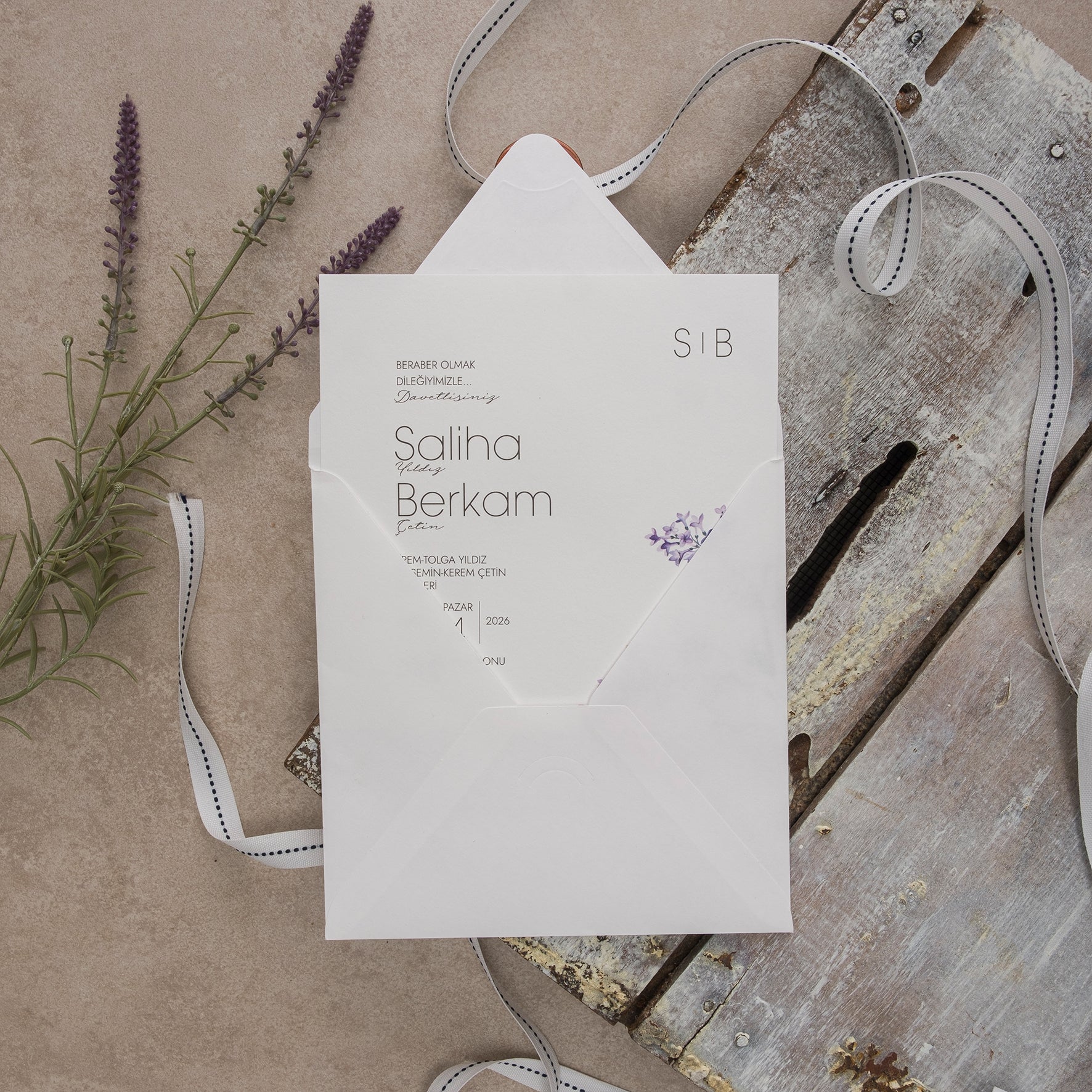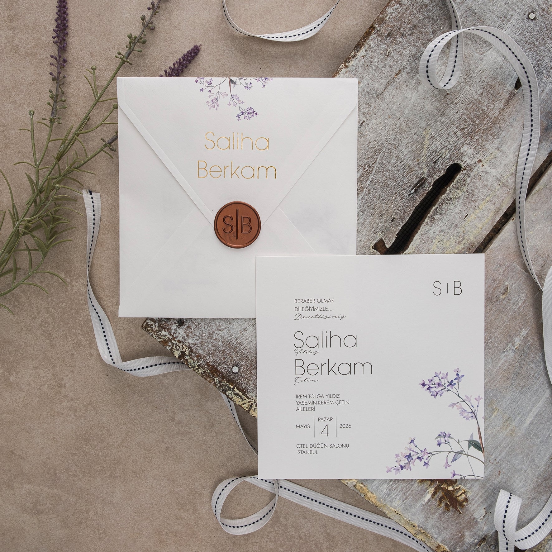 This modern wedding invitation perfectly blends elegance and simplicity with a clean square layout and delicate lavender floral accents. The names are printed in a stylish mix of serif and script fonts, offering a sophisticated visual flow, while the initials (SIB) add a personalized monogram charm.