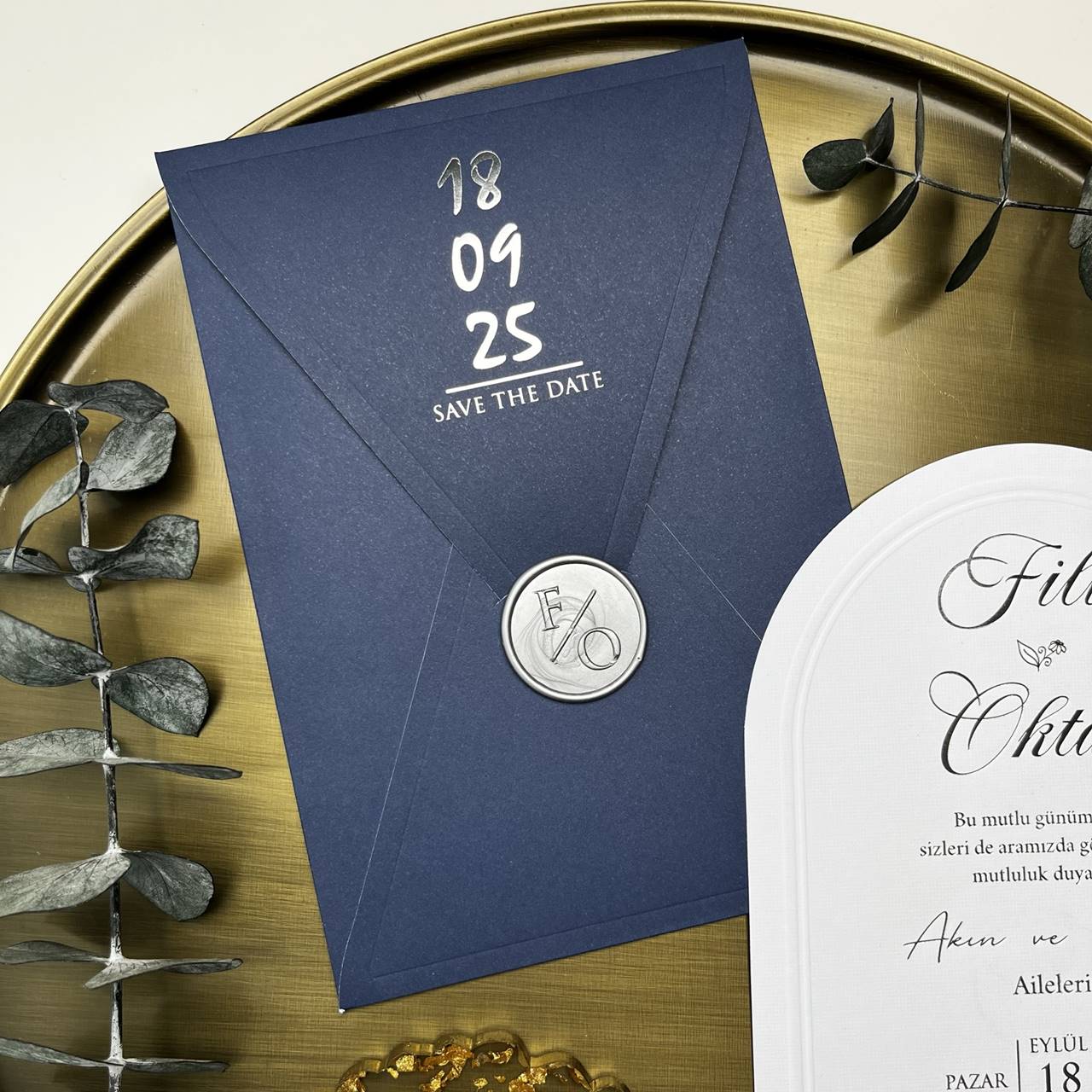 Inside the carefully folded navy blue envelope, your guests will discover a smooth white arched invitation card, elegantly printed in silver foil calligraphy and adorned with a soft embossed border. The front of the envelope features a vertical Save the Date layout in silver foil and is sealed with a custom monogram wax stamp in matching silver — adding a royal touch to every piece.