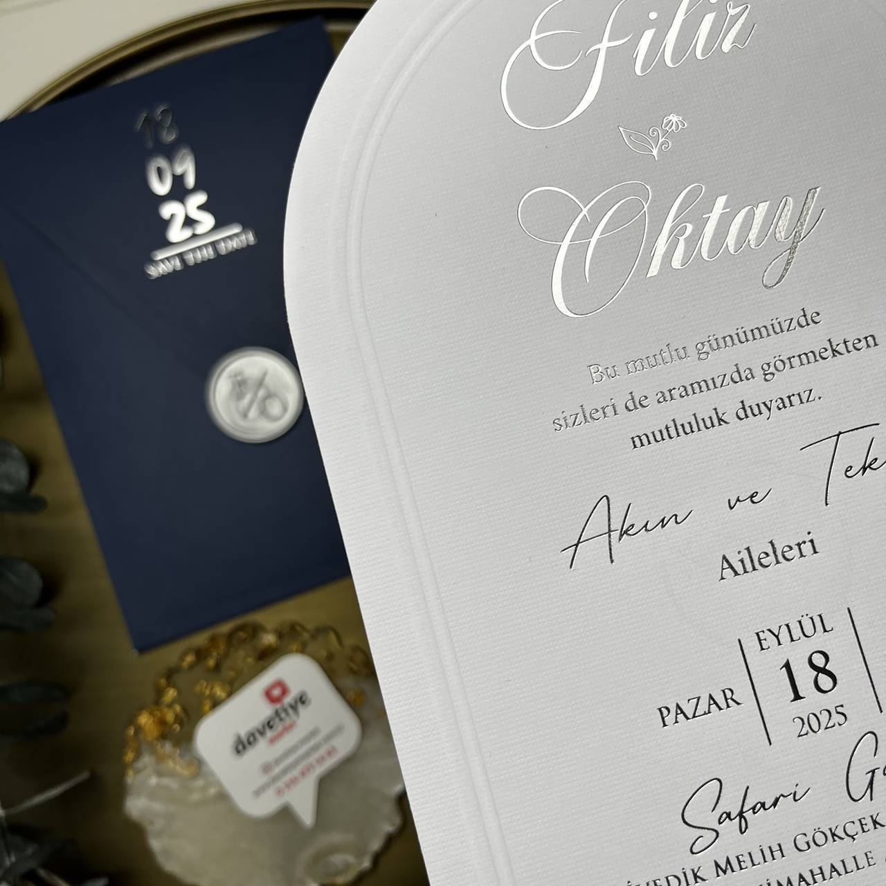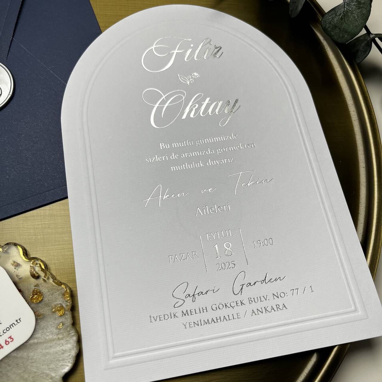 1x Arched invitation card (white with silver foil + embossed edge)