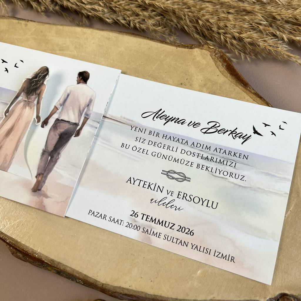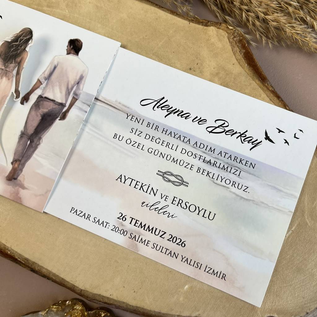 Celebrate your special day with our elegant beach-themed wedding invitation, featuring a romantic illustration of a couple walking hand-in-hand along the shoreline. Personalized with your names, date, and venue, this unique design offers a warm and artistic way to invite your loved ones.