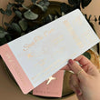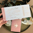 Say "I do" to adventure with our passport-themed wedding invitation, crafted in a soft blush pink cover with gold foil airplane detailing. This creative invitation mimics the look of a real passport and boarding pass, making it the perfect choice for destination weddings or travel-loving couples.