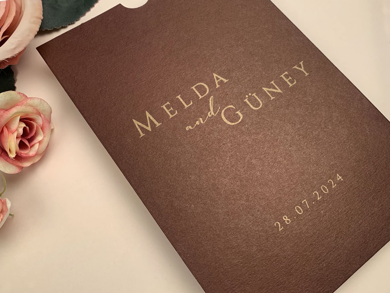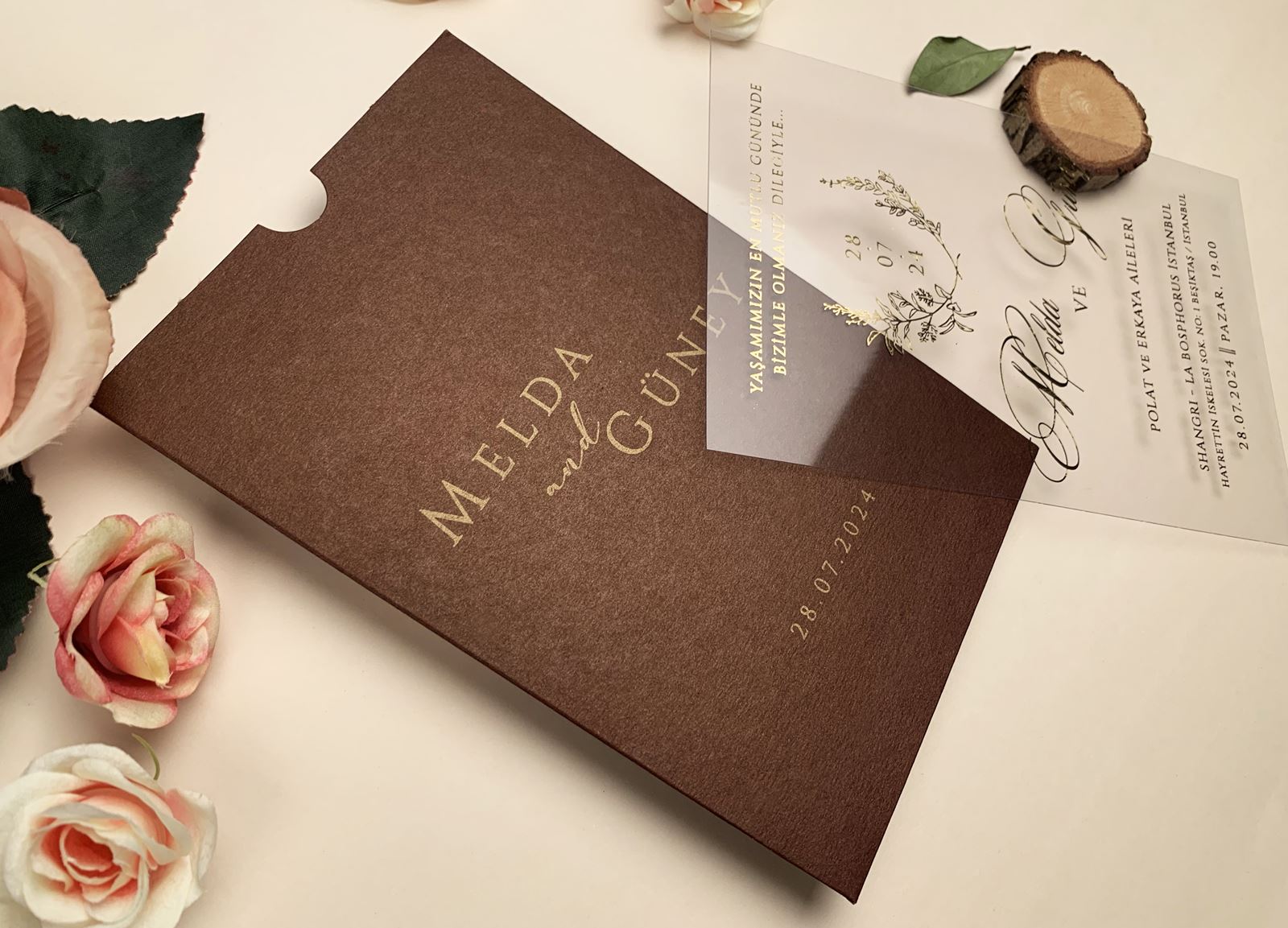 Make a glamorous first impression with our Clear PVC Wedding Invitation. Featuring luxurious gold foil lettering on transparent PVC and paired with a rich red sleeve, this design is both bold and elegant.
