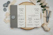 This sophisticated invitation combines a marbled background, gray band, and a personalized wax seal to create a unique and romantic presentation.