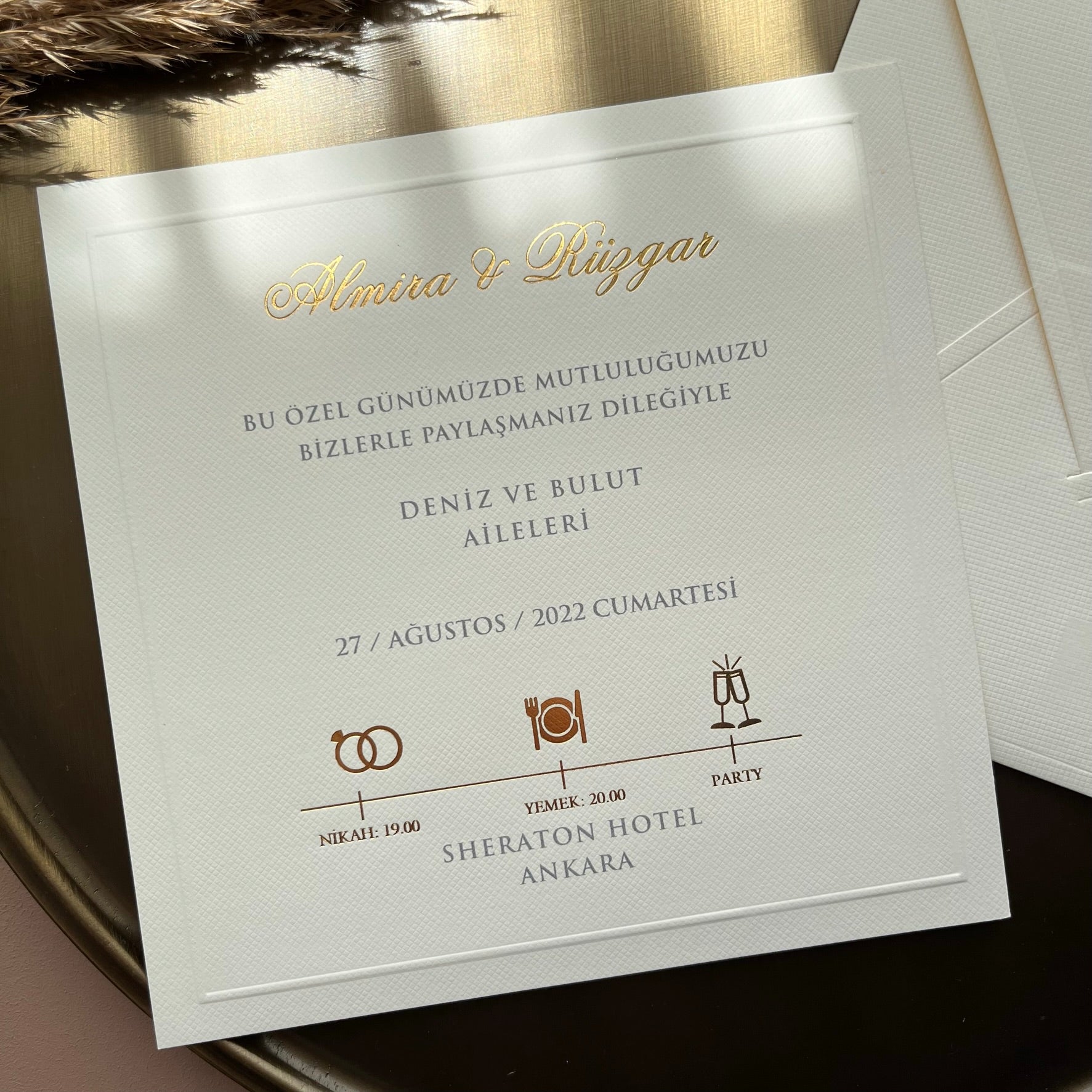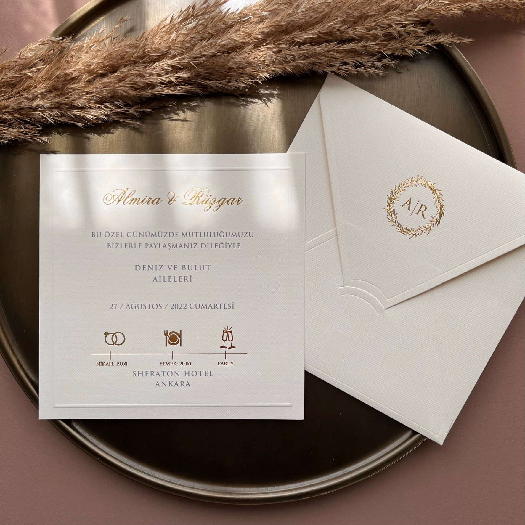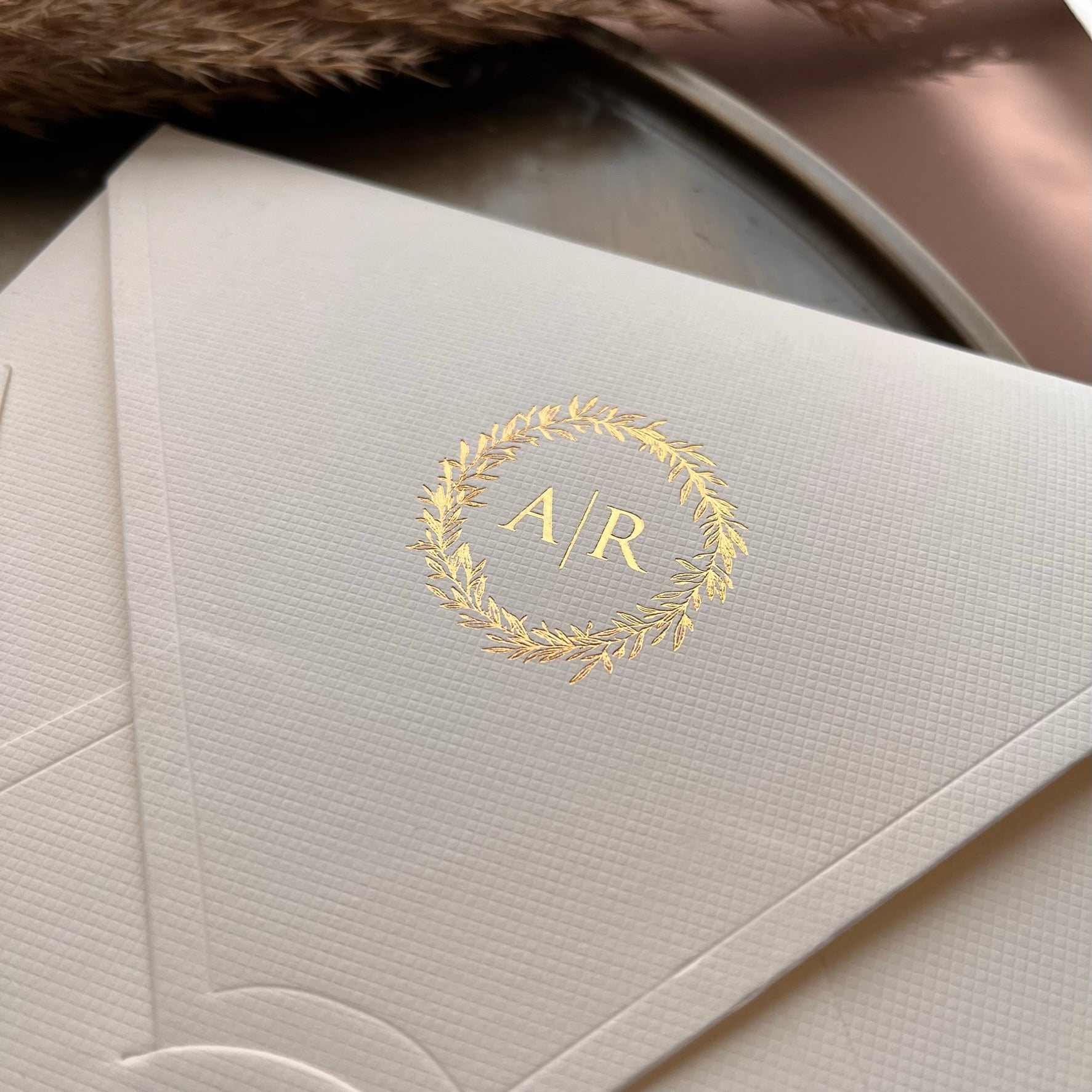 Celebrate your big day in timeless elegance with this square ivory wedding invitation. Featuring gold foil icons and text, paired with a matching textured ivory envelope and monogram crest, this design is the perfect choice for refined and classy wedding themes.