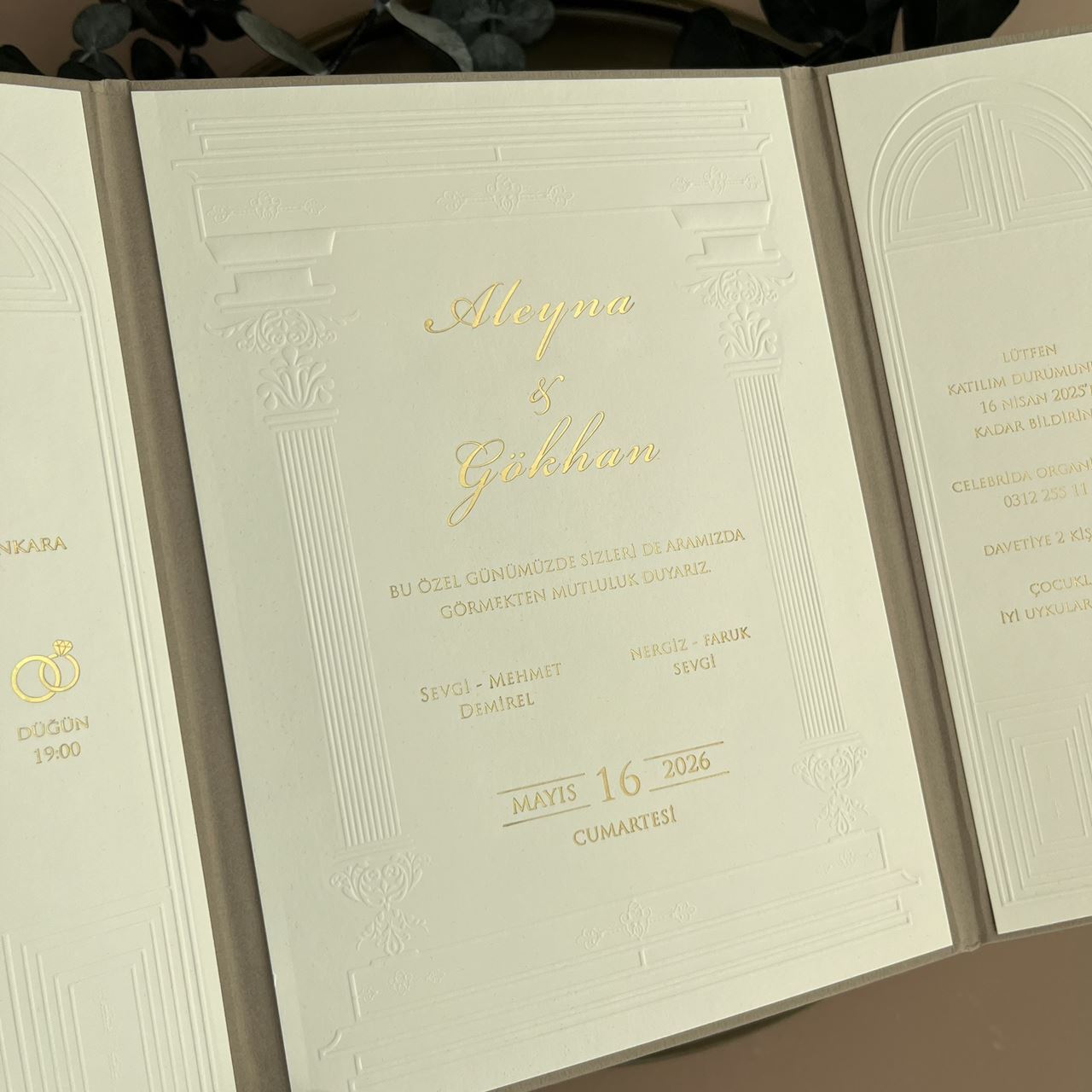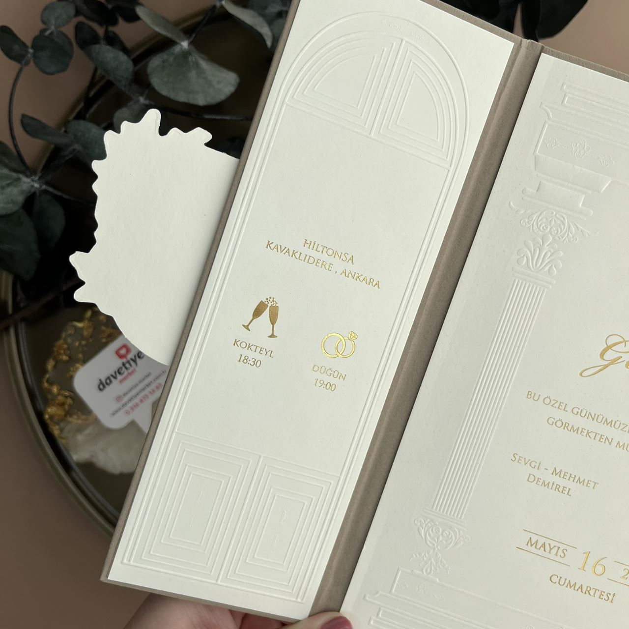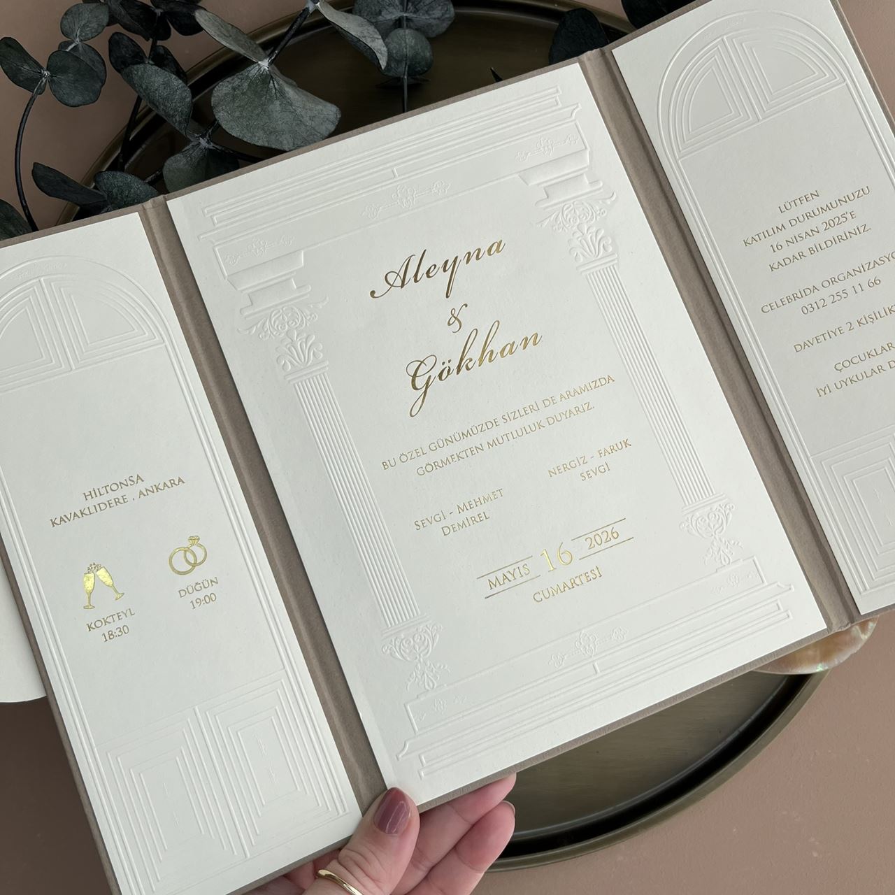 The exterior features a premium textured taupe folder, closed with a custom floral crest in soft ivory and shimmering gold. Upon opening, you're greeted with a fully embossed classical design and carefully printed gold foil details across the inner card.